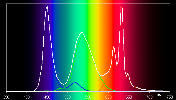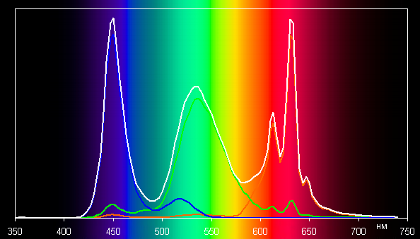 Ниже приведен спектр для белого поля (белая линия), наложенный на спектры красного, зеленого и синего полей (линии соответствующих цветов) в случае исходного цветового охвата: