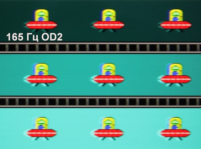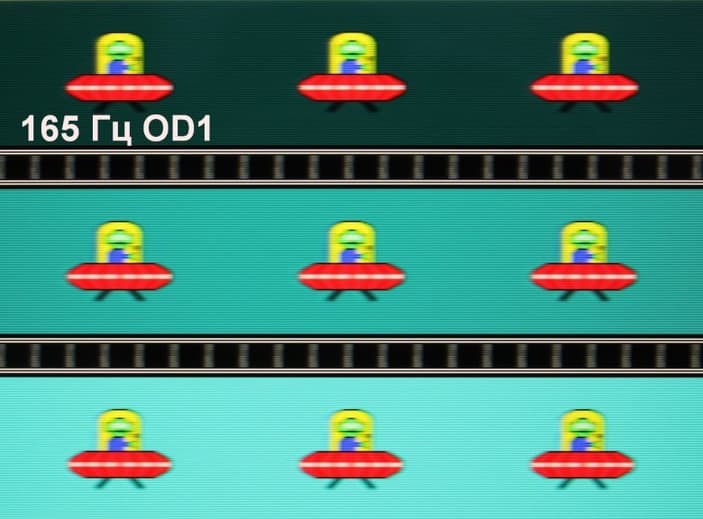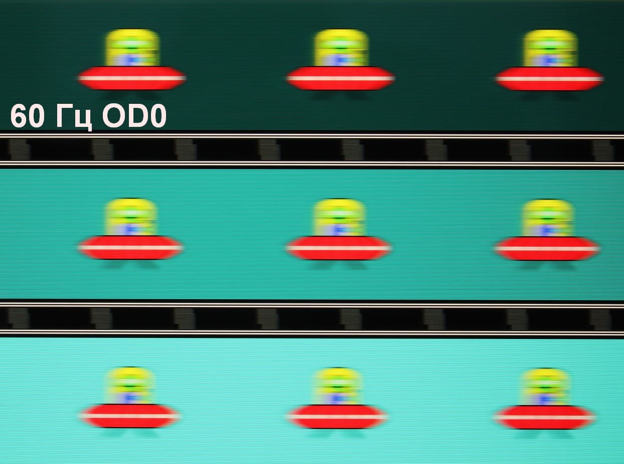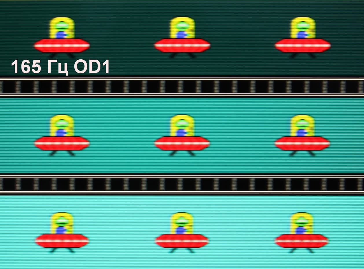 Для наглядного представления о том, что на практике означает такая скорость матрицы, и какие могут быть артефакты от разгона, приведем серию снимков, полученных с помощью движущейся камеры. Такие снимки показывают, что видит человек, если он следит глазами за двигающимся на экране объектом. Описание теста приведено тут, страница с самим тестом тут. Использовались рекомендованные установки (скорость движения 960 пиксель/с для частот обновления 60 и 120 Гц или 990 пиксель/с для 165 Гц, то есть на целое число пикселей за кадр), выдержка 1/15 с. На фотографиях указаны значения частоты обновления, а также включен ли разгон (ODx; x = 0 — 2).