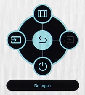 Нажатие на джойстик выводит на экран стартовое меню, из которого можно перейти к выбору входа, запустить пользовательскую функцию, выключить монитор и перейти к основному меню с настройками.