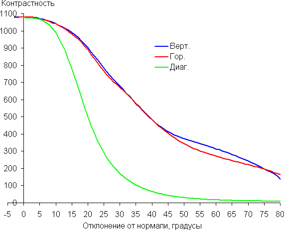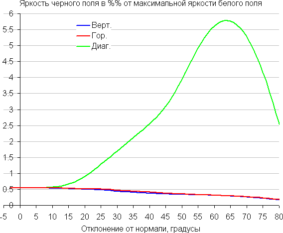 Углы обзора по снижению яркости не очень широкие. При отклонении в диагональном направлении яркость черного поля начинает резко возрастать уже при 20° отклонения от перпендикуляра к экрану, и возрастает максимум до примерно 5,8% от максимальной яркости белого поля. Даже для матрицы типа IPS это очень высокое значение. Если сидеть не очень далеко от экрана, то черное поле по углам будет заметно светлее, чем в центре (оставаясь примерно нейтрально-серым по оттенку). Контрастность в случае отклонения по диагонали опускается ниже отметки 10:1 при отклонении более чем на 74°.