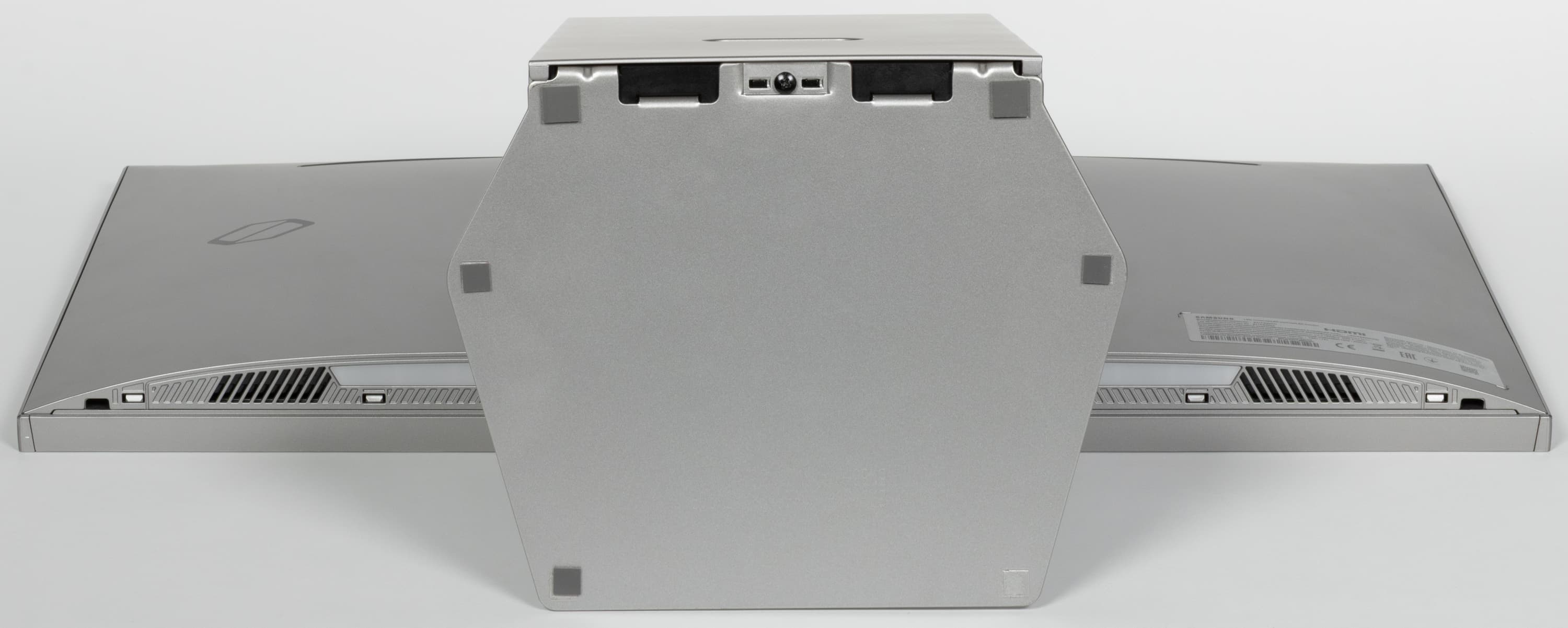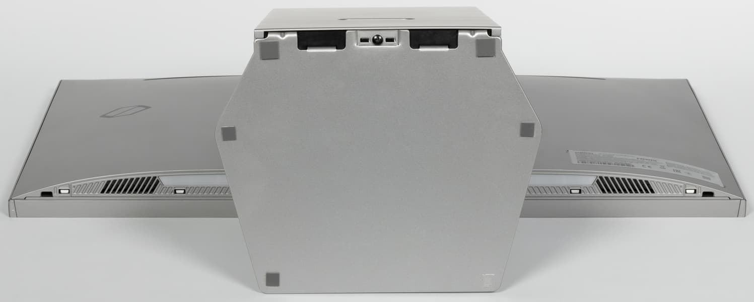 Вентиляционные решетки есть в верхней части на задней панели и на нижнем торце. Снизу за разнесенными от центра решетками расположены встроенные в монитор громкоговорители. Также в нижний торец встроена полоска из полупрозрачного белого пластика, за которой находится несколько RGB-светодиодов. Эту декоративную подсветку спереди не видно, она освещает только поверхность под монитором. В меню настроек монитора можно выбрать статичный вариант свечения с заданным цветом, один из динамичных или режим повторения цветов нижней части выводимого на экран изображения.