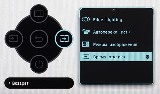 Навигация удобная, к тому же списки зациклены. При изменении некоторых настроек изображения основное меню убирается с экране, остается только ползунок с настройкой или короткий список с ползунками. Это облегчает оценку вносимых изменений. Можно выбрать задержку автоматического выхода из меню. Присутствует русская версия экранного меню.