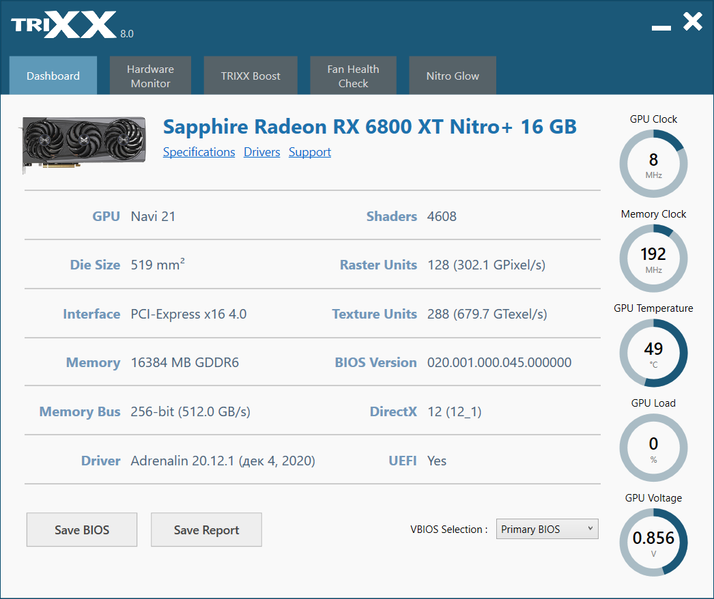 Sapphire Nitro+ Radeon RX 6800 XT (16 ГБ) — великолепный конкурент флагманским видеокартам на Nvidia GeForce RTX 3080 для игр без трассировки лучей: в целом эти карты почти на одном уровне, Radeon RX 6800 XT даже чуть впереди. Карта Sapphire имеет объемистую СО, занимает 3 слота в системном блоке, но зато кулер тихий, и есть возможность переключить его в еще более тихий режим (незначительно пожертвовав производительностью и допустив немного более высокий нагрев карты).