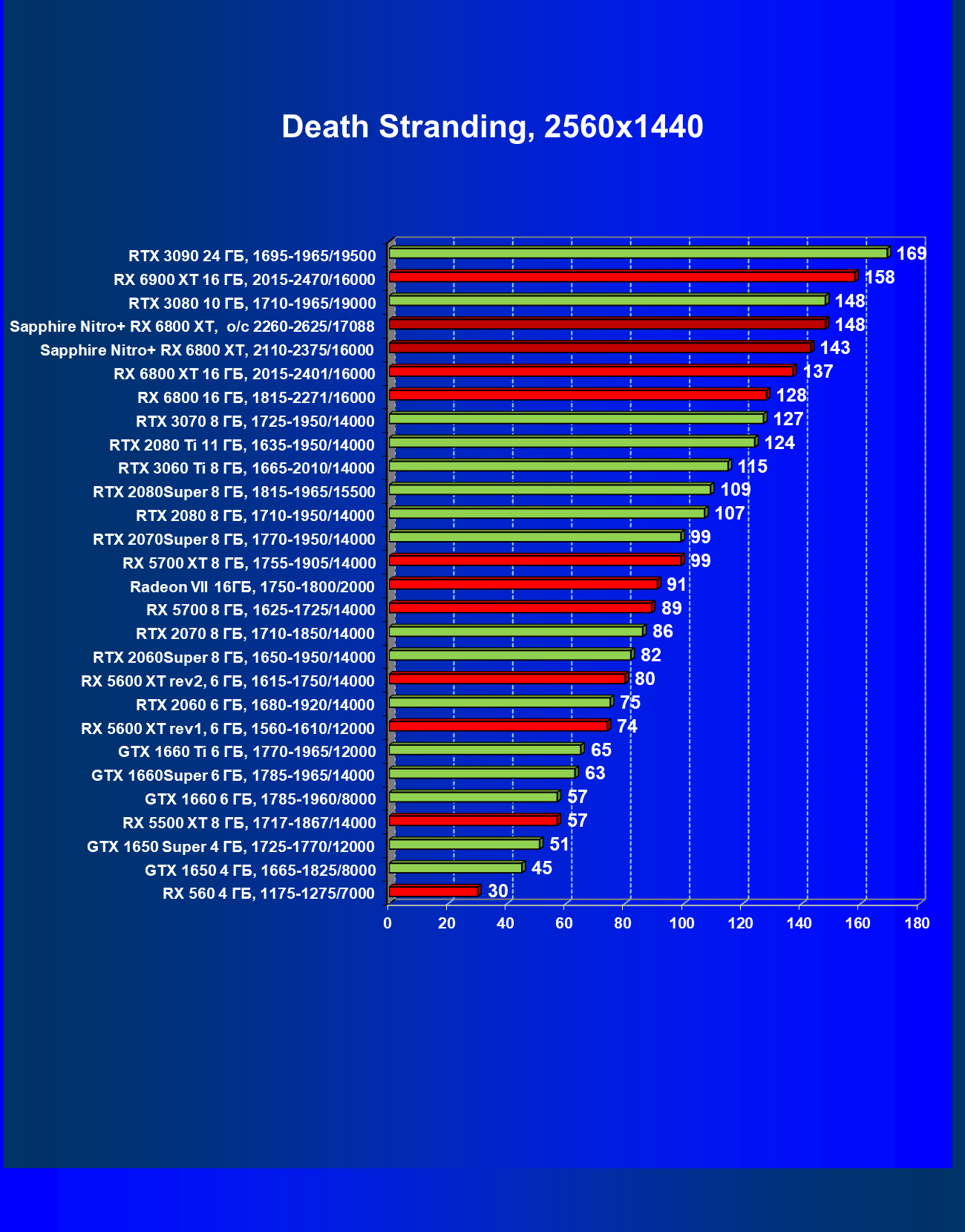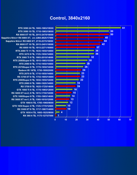 Nvidia GeForce RTX 3080 и AMD Radeon RX 6800 XT являются прямыми соперниками, они демонстрируют почти равную производительность, позволяющую комфортно играть в 4К при максимальных настройках графики, но только в игры без использования трассировки лучей (RT) — при включении трассировки лучей производительность Radeon 6800 XT может упасть до уровня GeForce RTX 3060 Ti. Видеокарта Sapphire немного более производительная, чем референсный аналог.