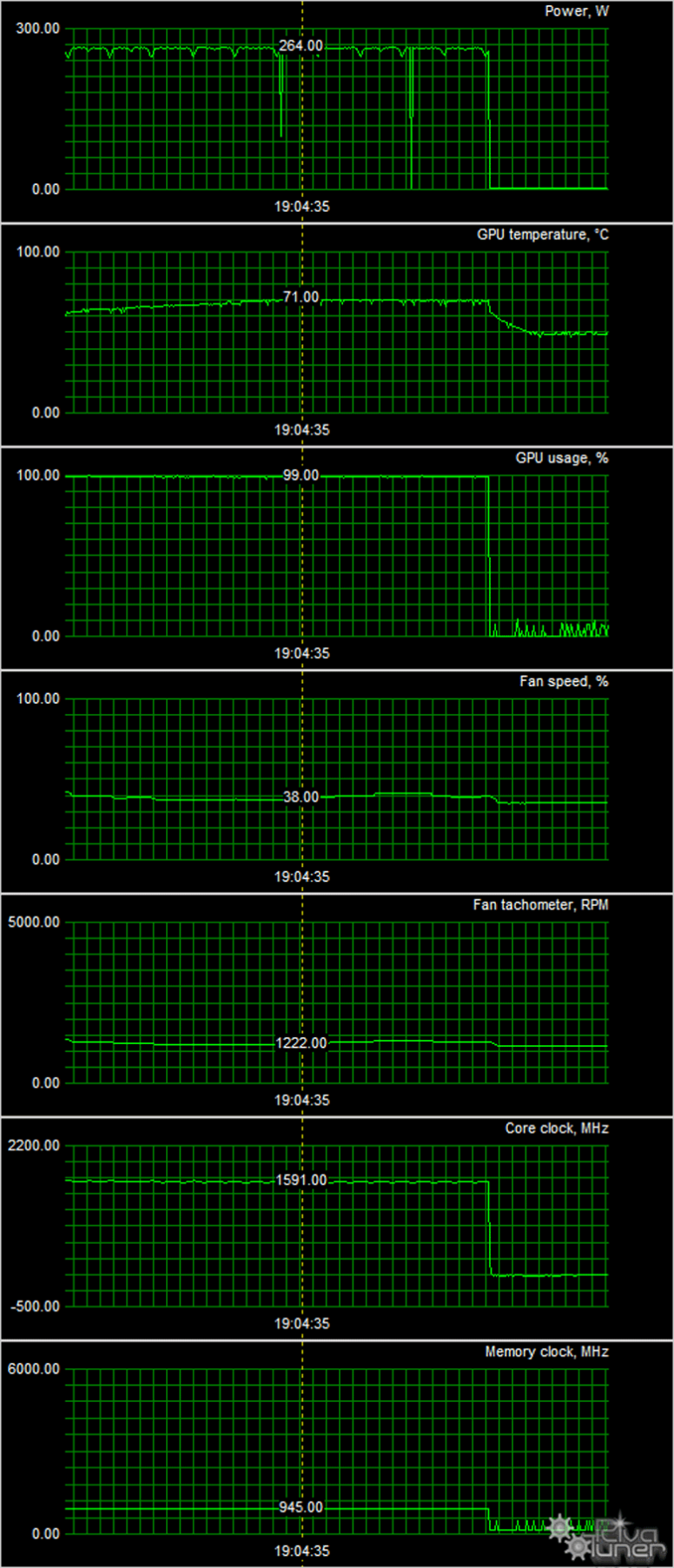 После 6-часового прогона под нагрузкой максимальная температура ядра не превысила 71 градус, что является отличным результатом для видеокарты такого уровня.