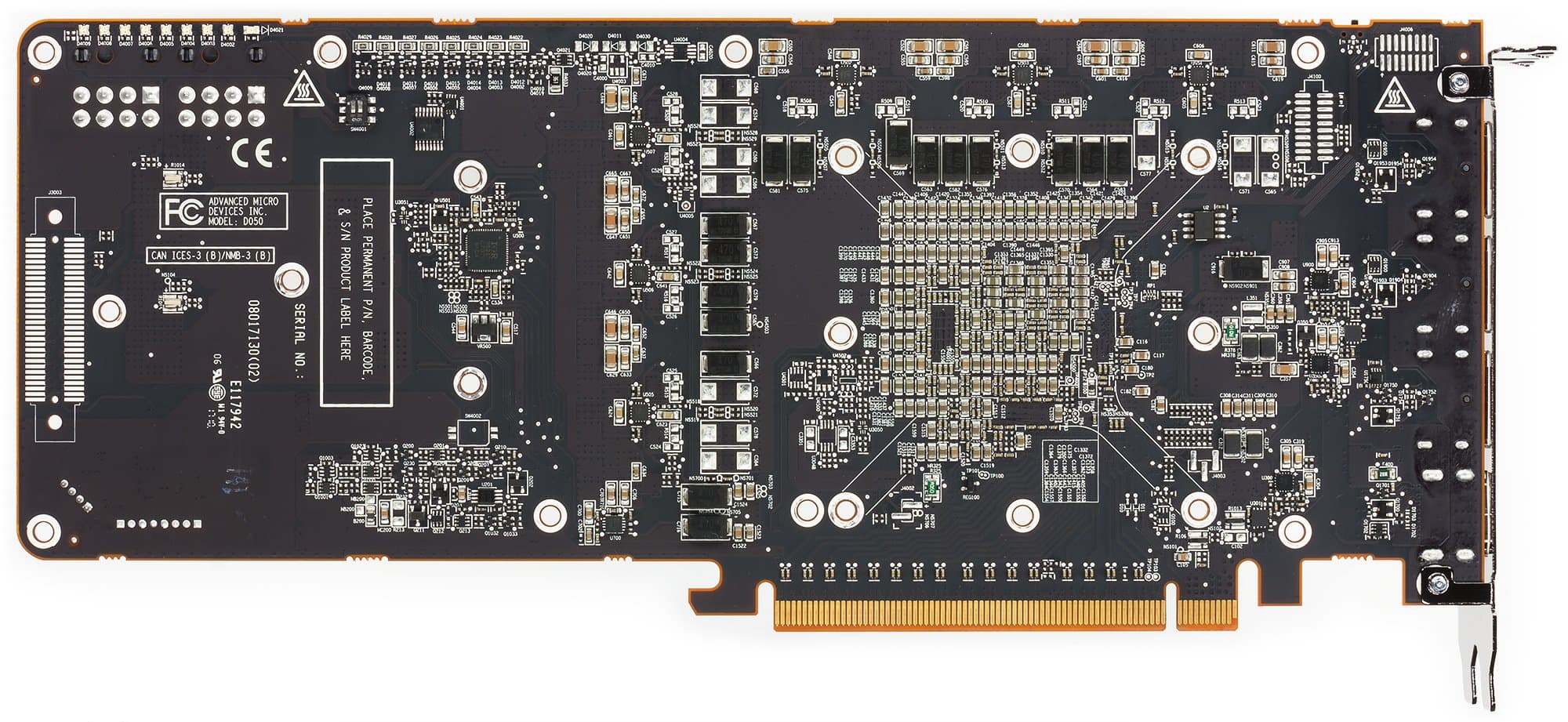 Инженеры компании Sapphire переработали PCB, усовершенствовав в основном блок питания: карта имеет увеличенное до трех количество разъемов питания, что гарантирует стабильную работу при повышении предела мощности (как известно, этот параметр можно менять в настройках драйверов AMD в разделе Wattman). Также мы видим, что фабрично частоты карты не повышены, равны стандартным значениям, поэтому все зависит от желания оверклокера: повышать ли частоту и насколько.
