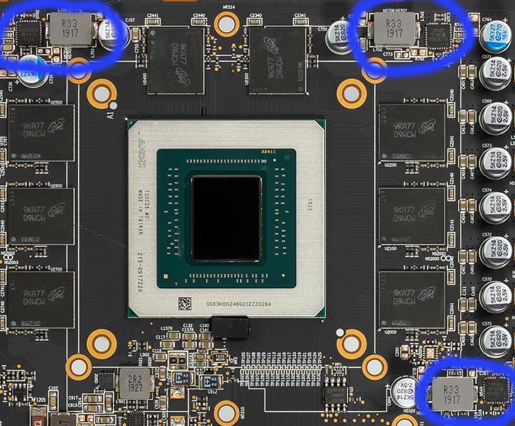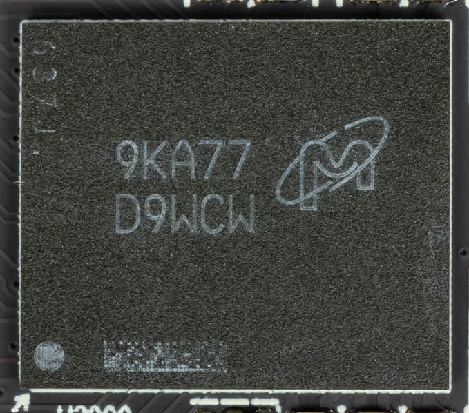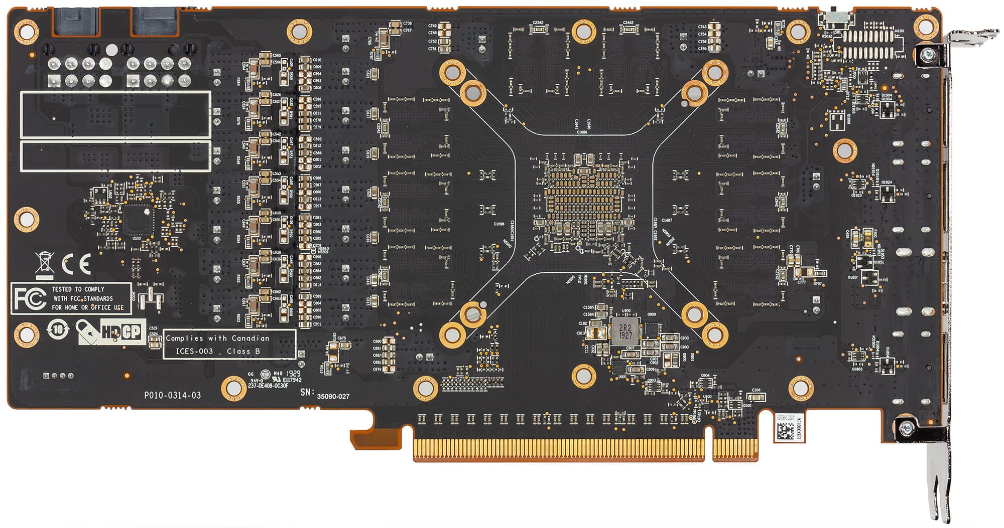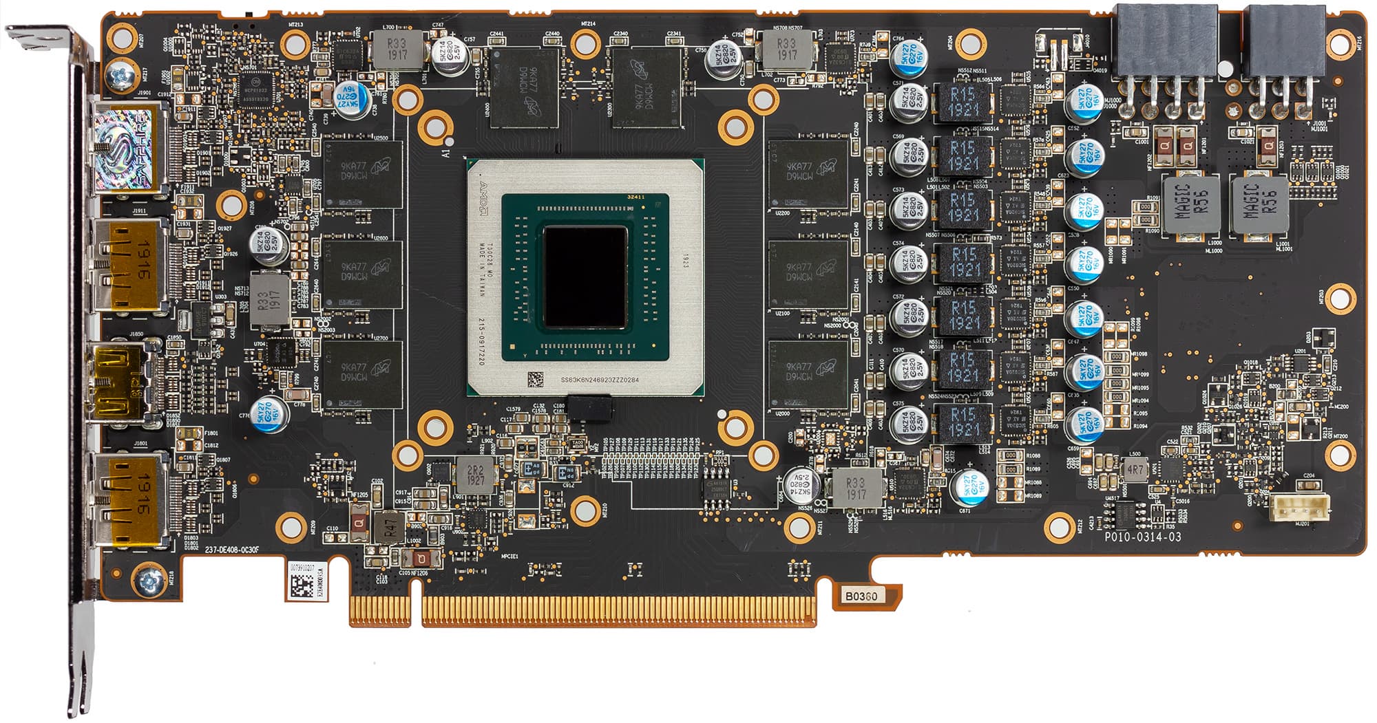 Карта имеет 8 ГБ памяти GDDR6 SDRAM, размещенной в 8 микросхемах по 8 Гбит на лицевой стороне PCB. Микросхемы памяти Micron (GDDR6) рассчитаны на номинальную частоту работы в 3500 (14000) МГц