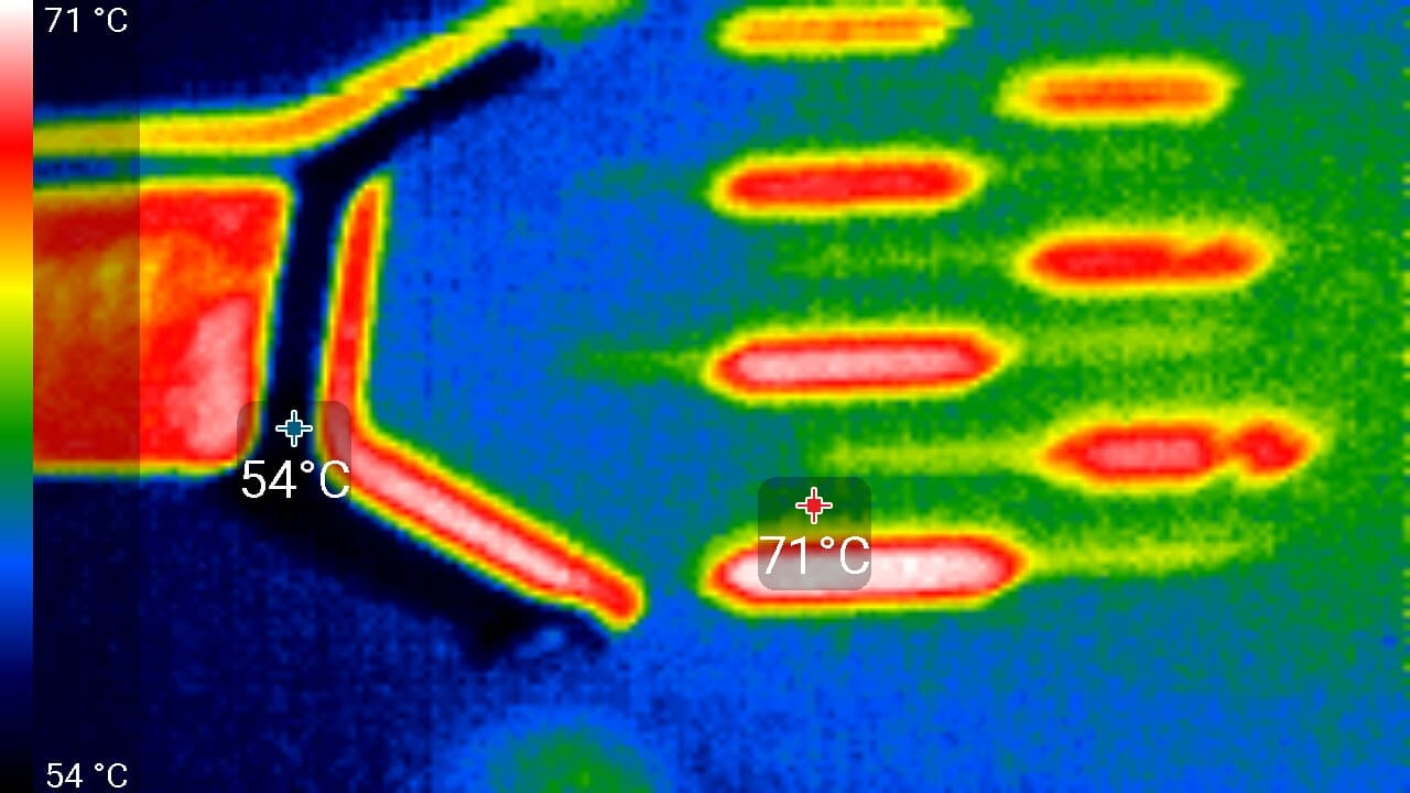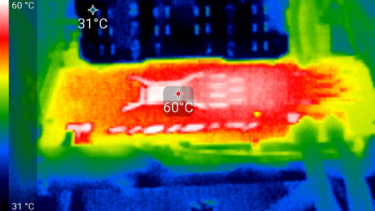 Максимальный нагрев — центральный участок PCB около GPU и силовых преобразователей.