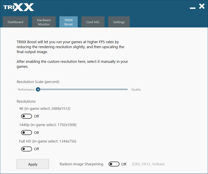 И вот, наверное, самая интересная вкладка: Trixx Boost. С ее помощью можно включить рендеринг (растеризацию) 3D-графики в более низком разрешении, чем текущее выставленное в игре, так что ускоритель выдаст более высокую скорость, а по окончании происходит апскейлинг (растягивание) полученной картинки до текущего разрешения.