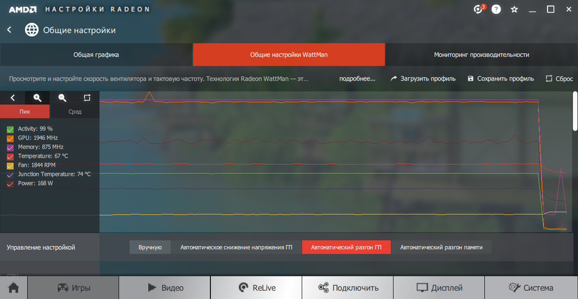 С помощью встроенной в драйверы AMD утилиты Wattman я попробовал разогнать карту без стремления поставить рекорд, ибо существует старший ускоритель Radeon RX 5700 XT, который уже будет логично разгонять максимально. По сути, был включен авторазгон.