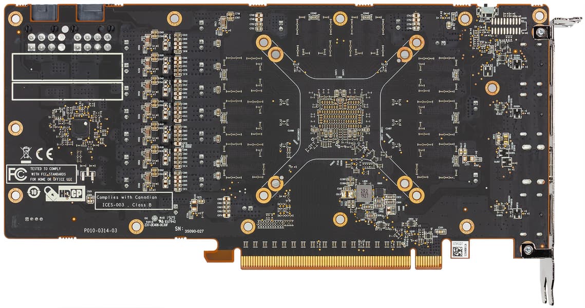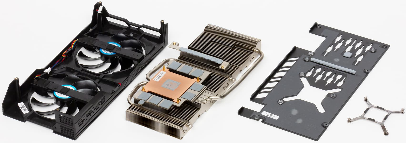 Основой СО является большой никелированный радиатор с пластинчатыми ребрами, все части которого пронизаны тремя тепловыми трубками, прижимающимися к большой подошве, на которой имеется медная вставка для прижатия к микросхеме GPU, а также имеется термоинтерфейс для охлаждения микросхем памяти. К силовым элементам конвертера питания прижимается отдельная подошва на том же радиаторе. На обороте карты установлена толстая пластина, служащая не только элементом жесткости, но и охладителем PCB.