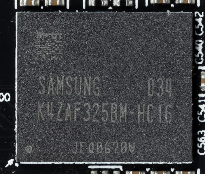 Карта имеет 16 ГБ памяти GDDR6 SDRAM, размещенной в 8 микросхемах по 16 Гбит на лицевой стороне PCB. Микросхемы памяти Samsung (GDDR6, K4Z80325BC-HC16) рассчитаны на условную номинальную частоту работы в 4000 (16000) МГц.