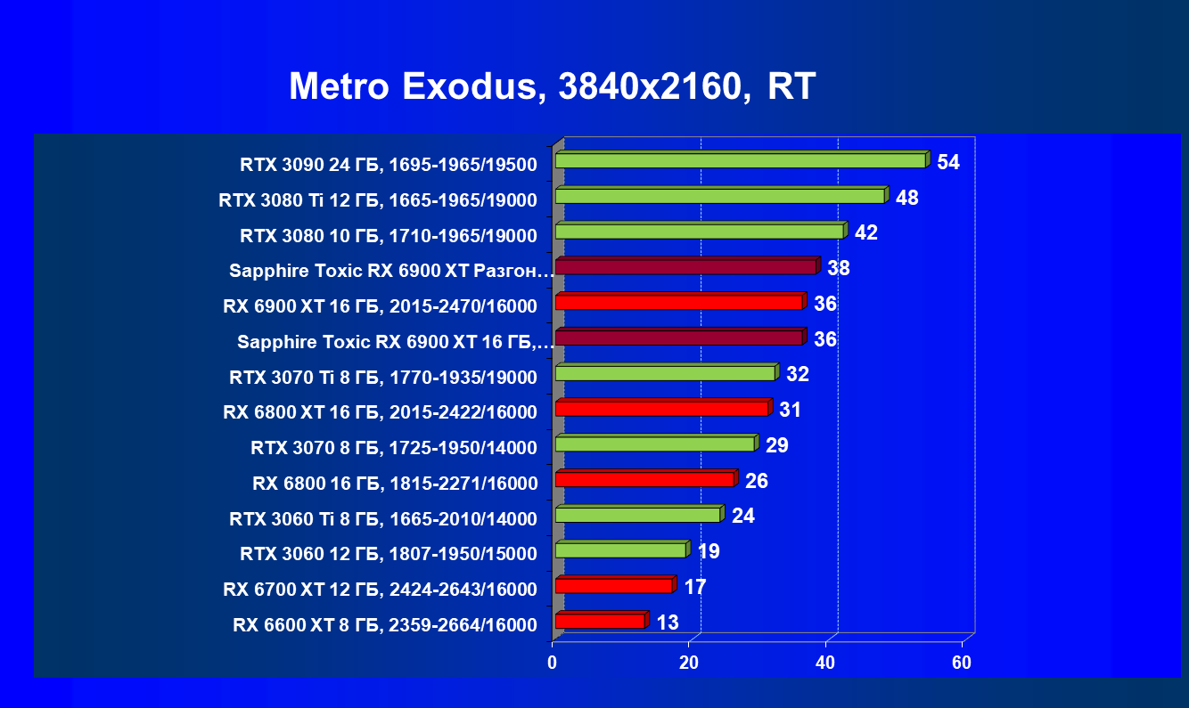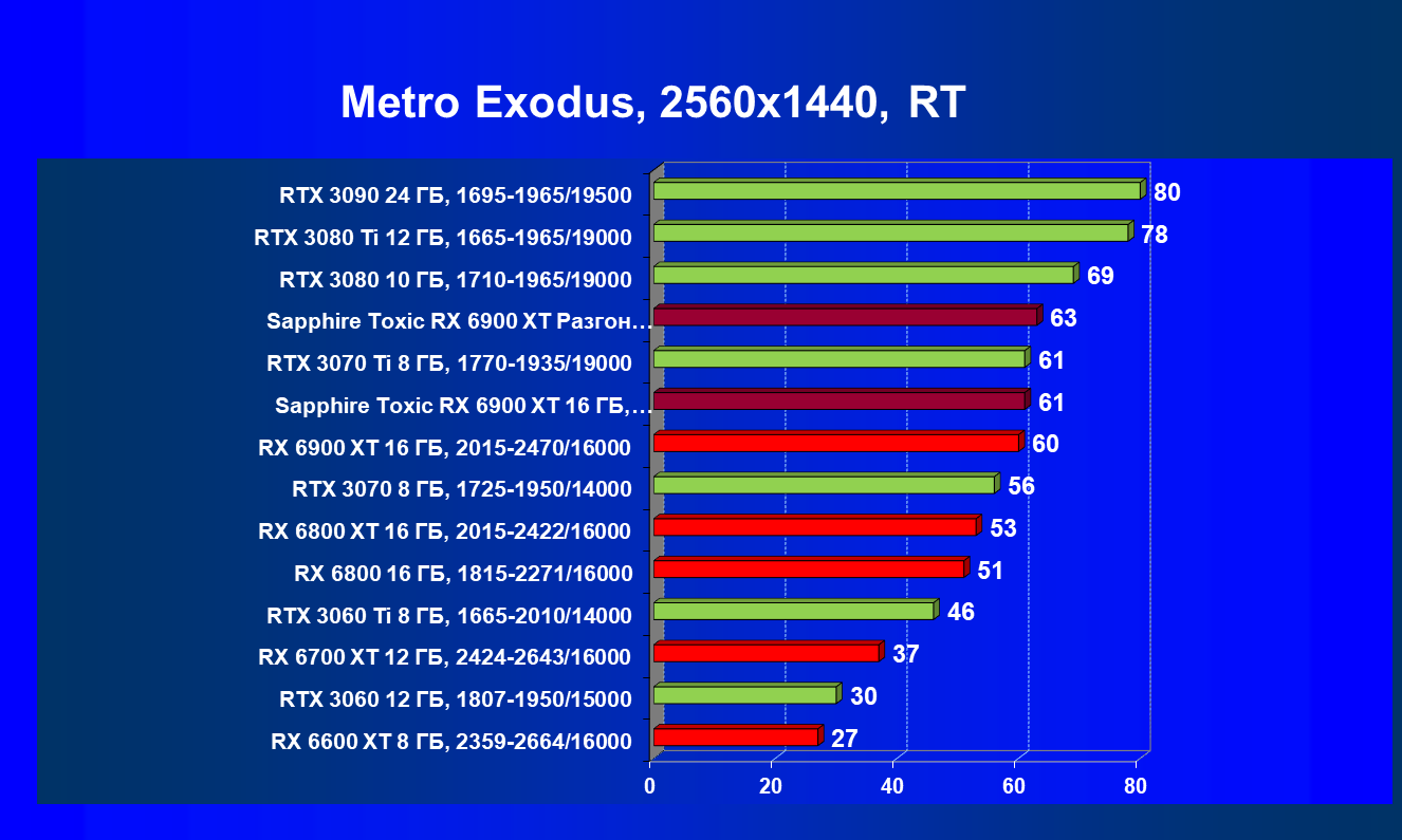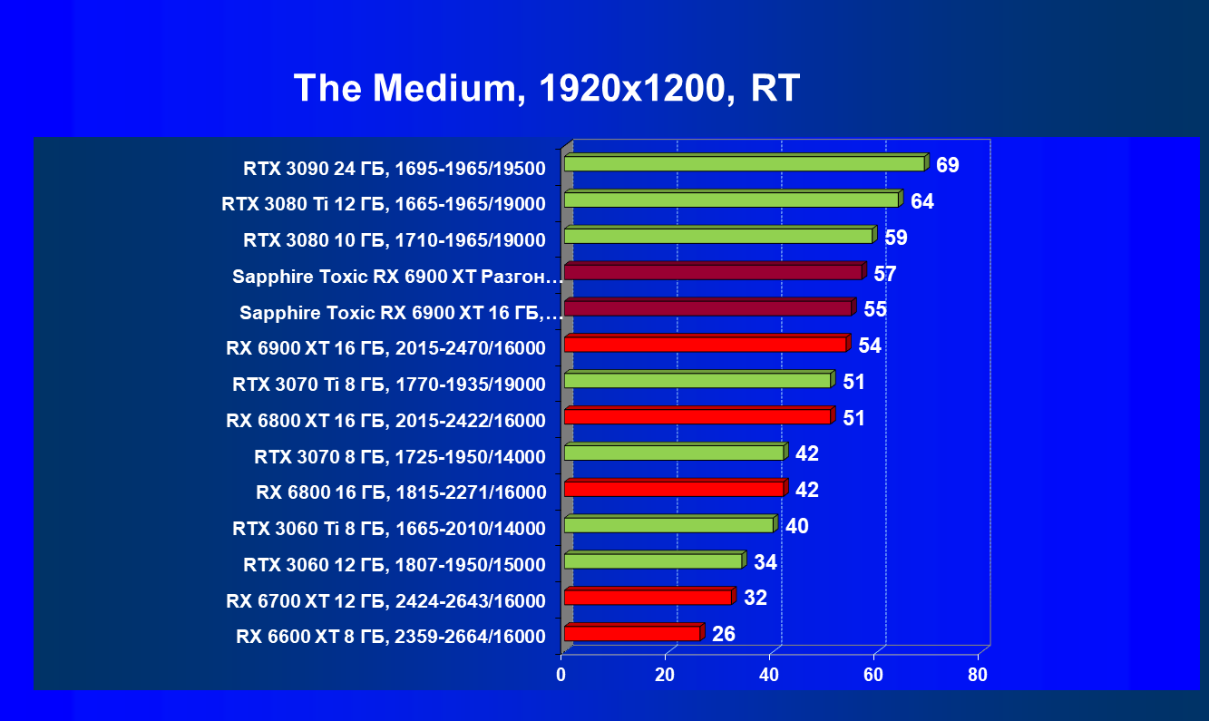 Я уже ранее говорил о том, что в классических играх RX 6900 XT — это просто «пушка»! Мы наблюдаем полное и безоговорочное лидерство карты Sapphire (как и в целом Radeon RX 6900 XT) в играх современного уровня с настройками на максимум. Подчеркну еще раз, — без трассировки лучей.