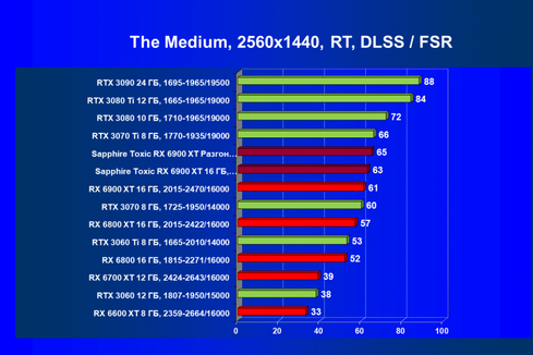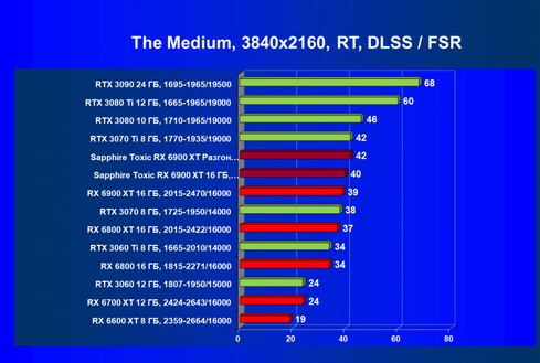 Рейтинг составлен по 8 тестам с применением технологии трассировки лучей (с Nvidia DLSS и с AMD FSR в играх The Medium и Far Cry 6). Этот рейтинг нормирован по самому слабому ускорителю в данной группе — GeForce RTX 3060 (то есть сочетание скорости и функций GeForce RTX 3060 приняты за 100%).