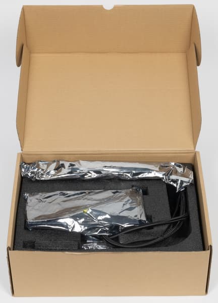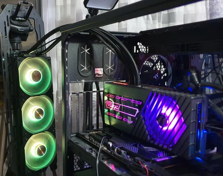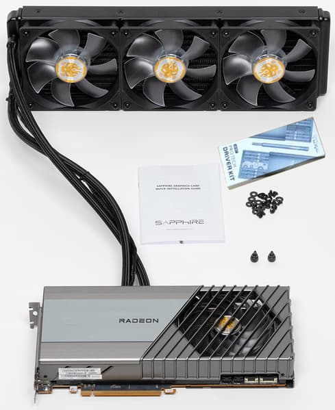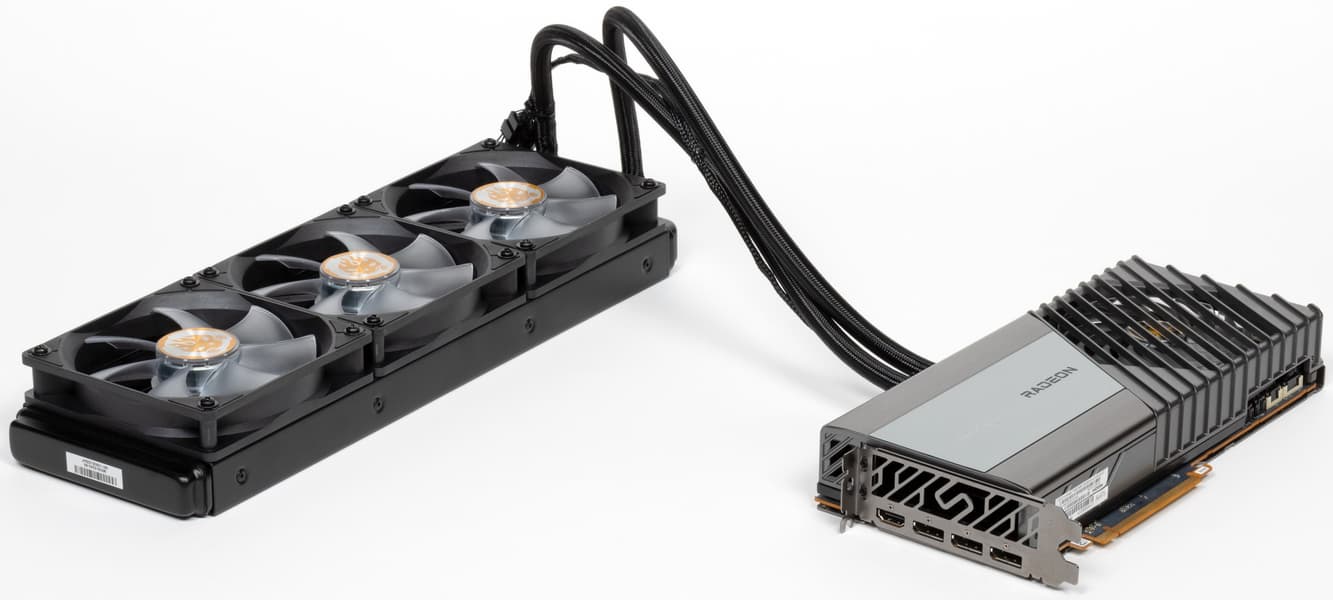 Ну вот и самая основная фишка этого ускорителя, не зря же в такой огромной коробке он прибыл. У нас карта с комбинированной системой охлаждения: что-то охлаждается вентилятором на самой карте, а что-то через «водянку», то есть СЖО.
