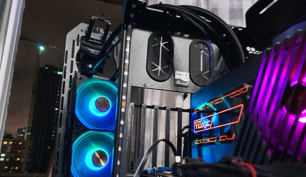 На выносном радиаторе СЖО установлено три вентилятора ∅120 мм, имеющих прозрачные лопасти, оснащенные ARGB-подсветкой.