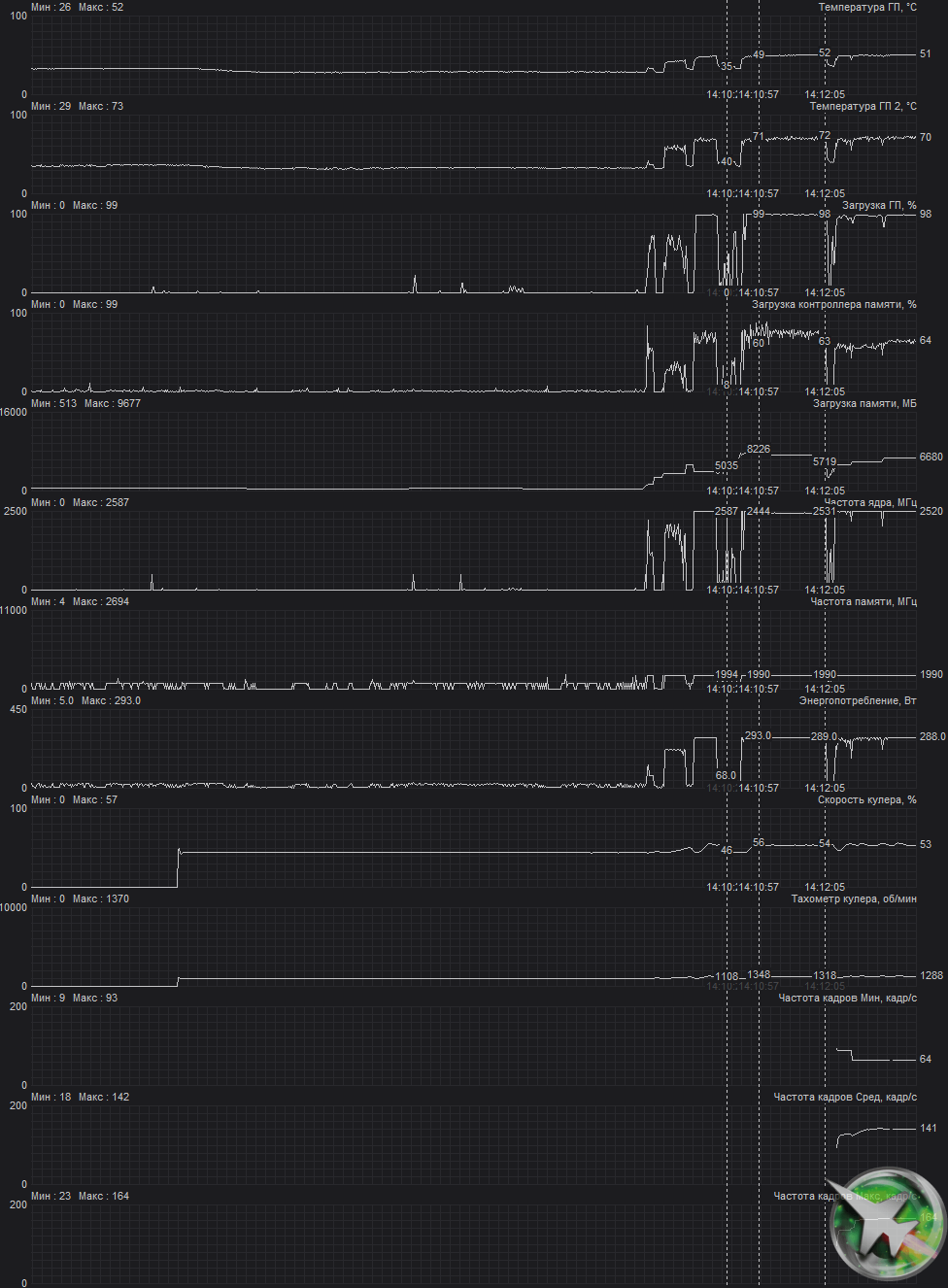 При описанном выше ручном разгоне параметры работы карты почти не менялись, максимальное потребление вырастало до 299 Вт.