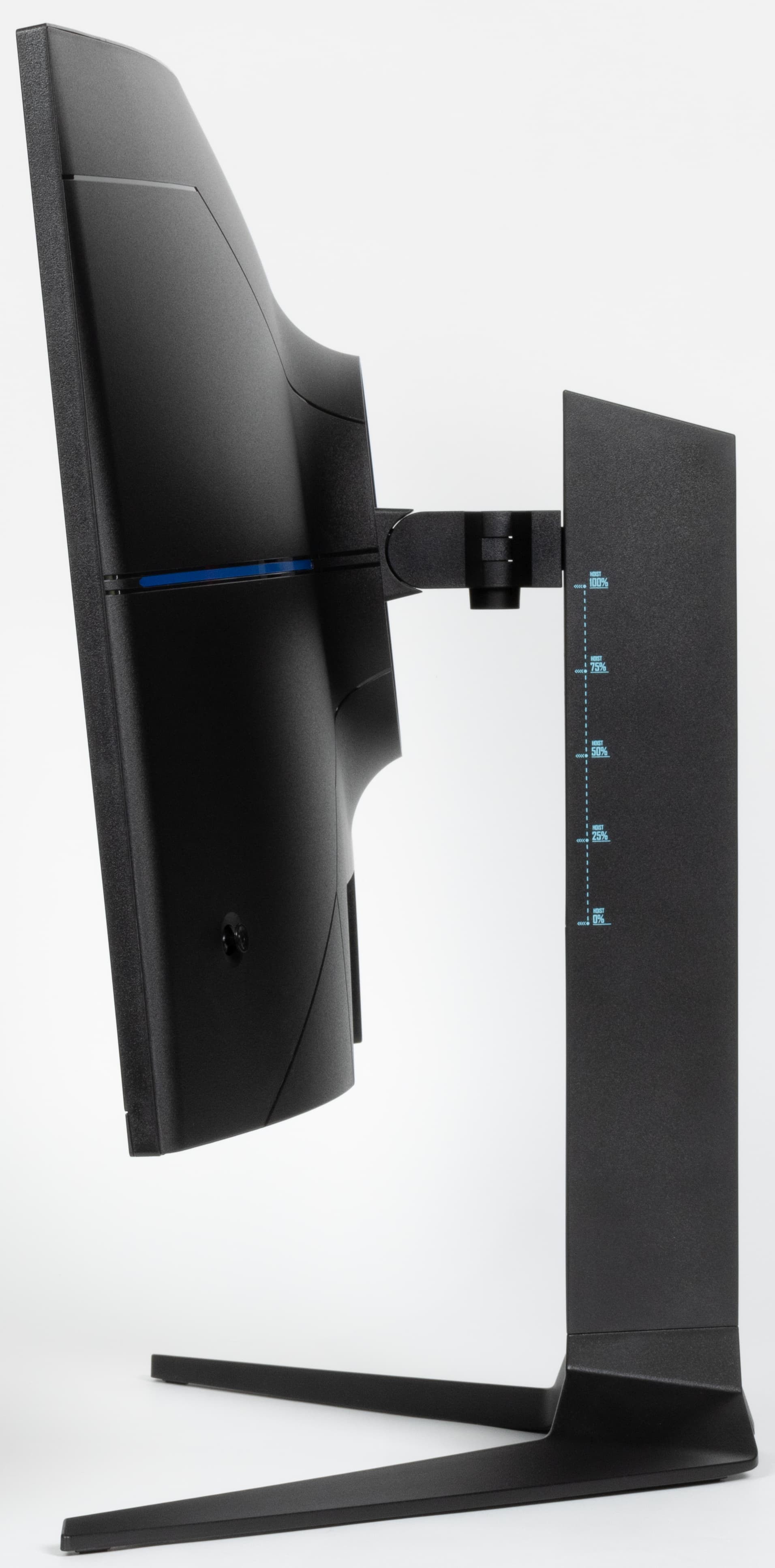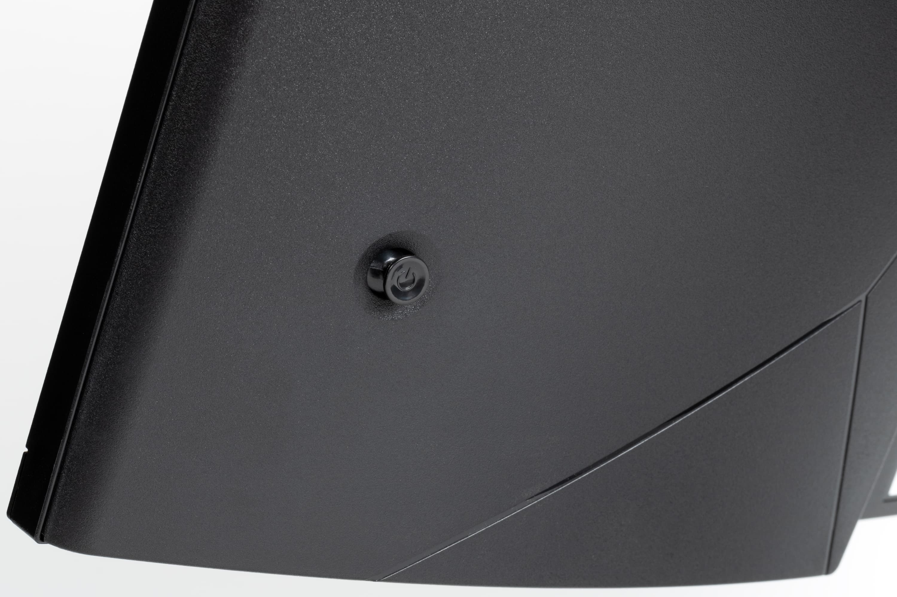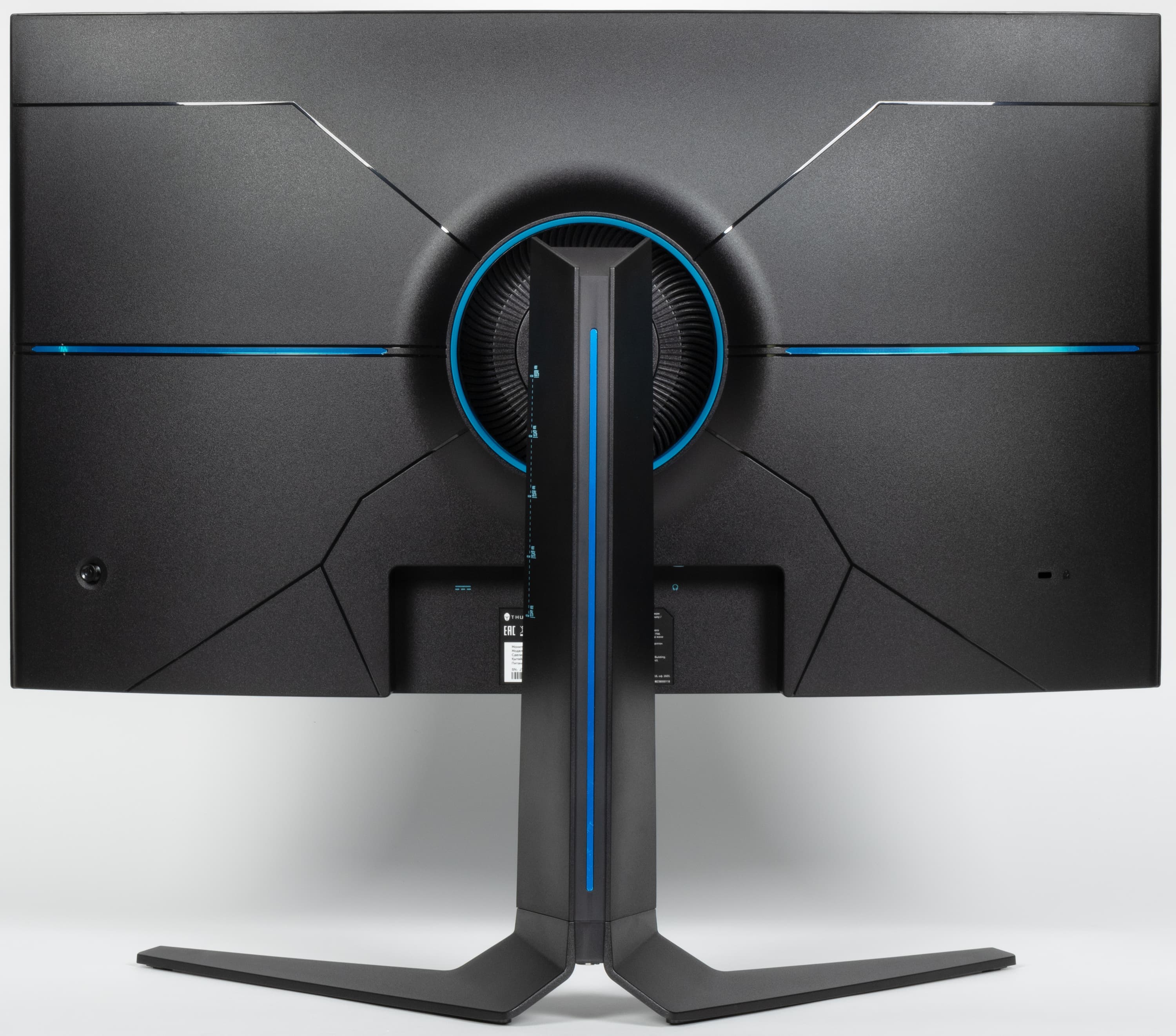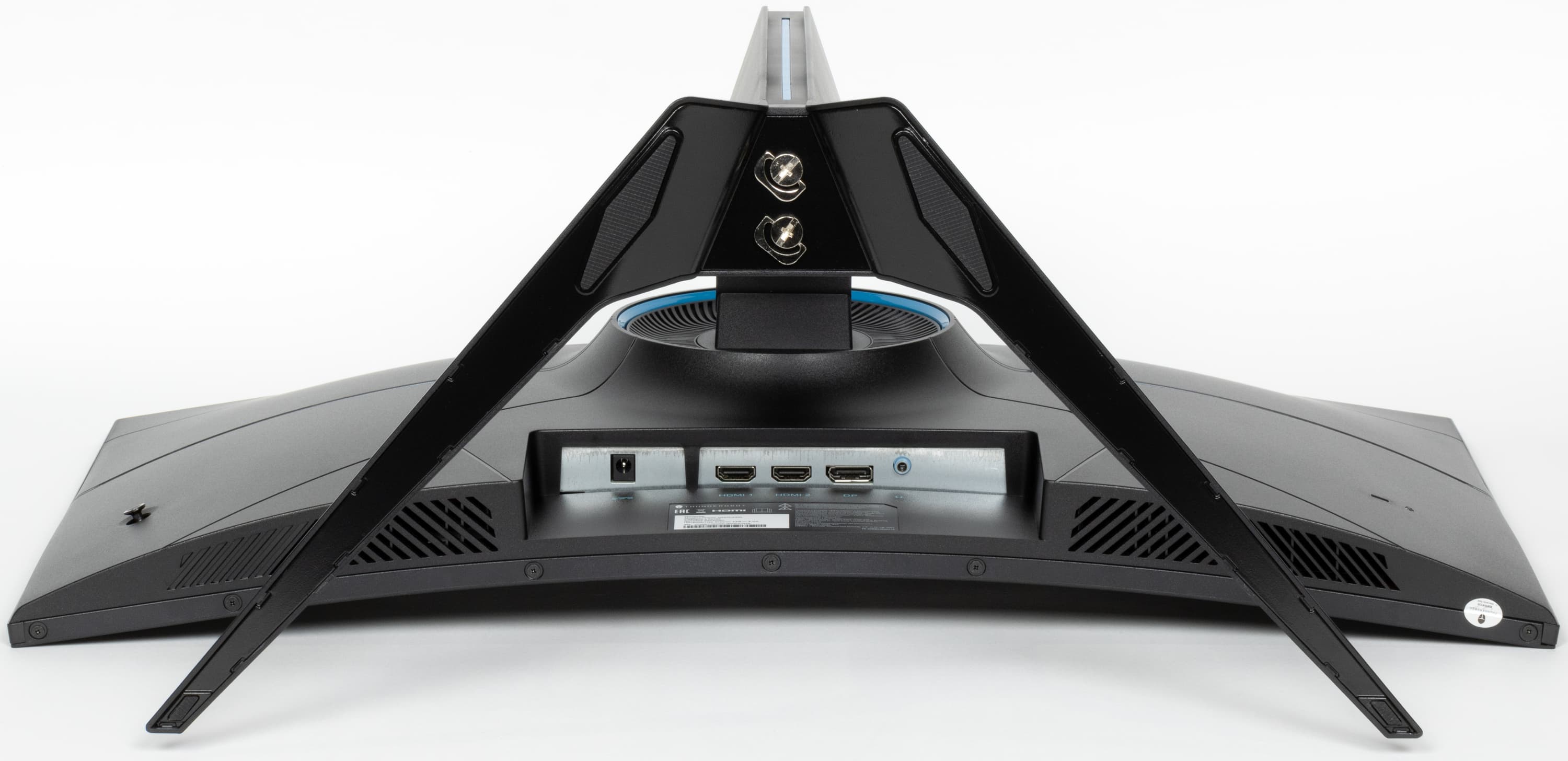 Дизайн строгий, игровую направленность в явном виде ничего не выдает. Панели блока экрана и кожухи подставки изготовлены из черного пластика в основном с матовой поверхностью. Внешняя поверхность матрицы черная, полуматовая (зеркальность хорошо выражена), внешний слой матрицы жесткий. Плоскость экрана изогнута по цилиндру так, что правый и левый край немного выдвинуты вперед. Заявленный радиус изгиба равен 1,5 м. Равномерность кривизны экрана у данной модели хорошая, правда в вертикальной полосе шириной порядка 10 см у правого и левого края экран практически плоский, но это характерно для всех изогнутых ЖК-экранов. Спереди экран выглядит как монолитная поверхность, ограниченная снизу неширокой планкой, а по периметру — узкой окантовкой. Выведя изображение на экран, можно увидеть, что на самом деле между внешними границами экрана и собственно областью отображения есть неширокие поля.