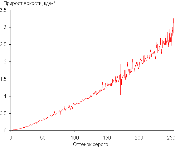 Реальная гамма-кривая ближе всего к стандартной при выборе варианта Гамма 2.2, поэтому далее мы измерили яркость 256 оттенков серого (от 0, 0, 0 до 255, 255, 255) при этом значении. График ниже показывает прирост (не абсолютное значение!) яркости между соседними полутонами: