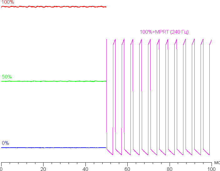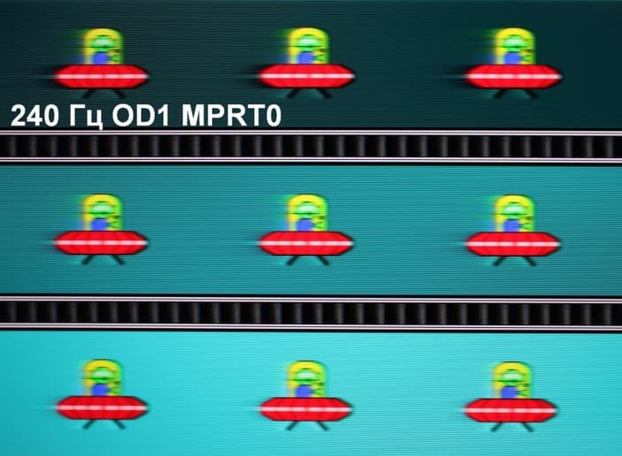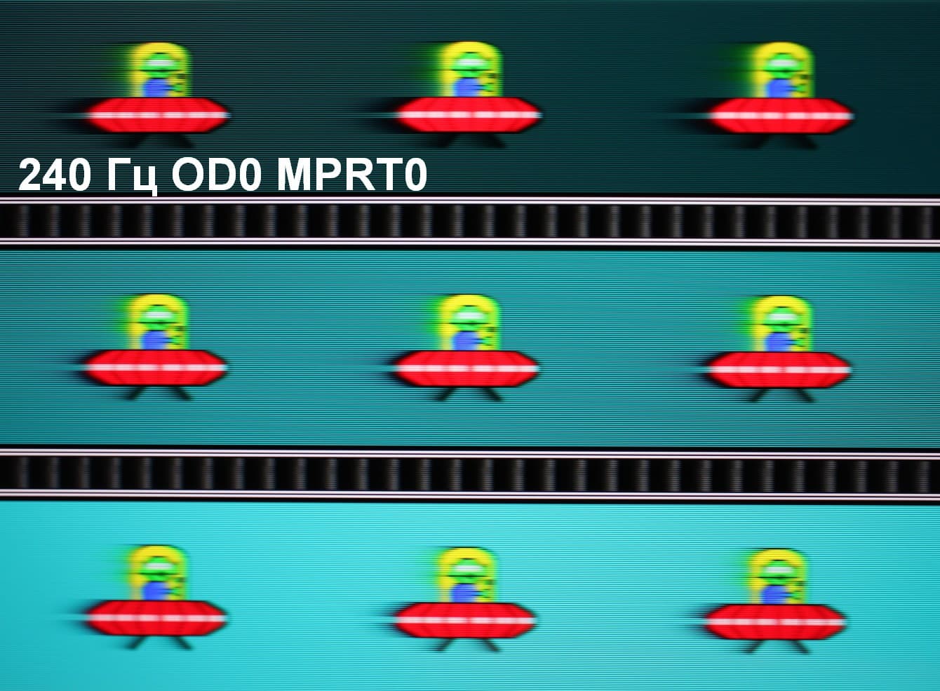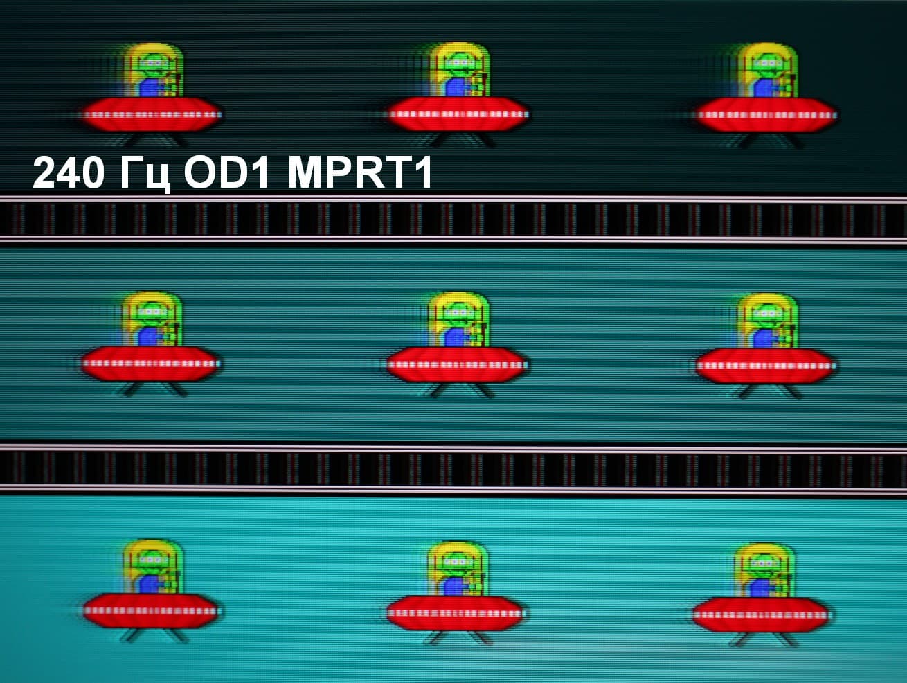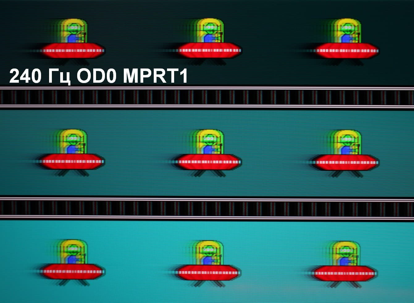Есть режим со вставкой темного кадра (черным он в данном случае не является) с названием MPRT. Зависимости яркости (вертикальная ось) от времени (горизонтальная ось) когда эта функция включена приведена на правой половине рисунка выше. Четкость в движении действительно повышается (и производитель может указывать невероятные 0,5 мс с оговоркой, что это характеристика MPRT), но на динамичной картинке появляются артефакты, о чем будет рассказано ниже, а из-за мерцания с частотой максимум в 240 Гц данный режим рекомендуется использовать с осторожностью, так как мерцание может приводить к повышенной утомляемости глаз. К тому же при включении этого режима сильно снижается яркость (до 84 кд/м²), что также снижает его ценность.
