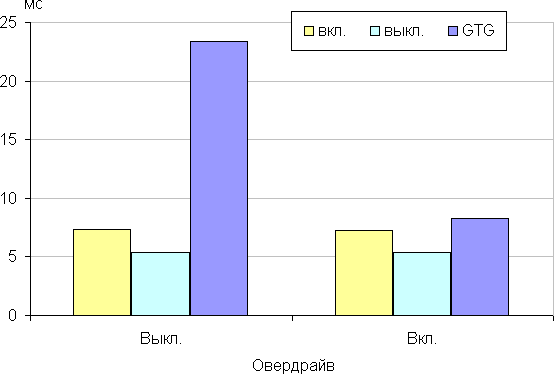Время отклика зависит от значения настройки Овердрайв, которая управляет разгоном матрицы. График ниже показывает, как меняется время включения и выключения при переходе черный-белый-черный (столбики «вкл.» и «выкл.»), а также среднее суммарное время для переходов между полутонами (столбики GTG) в случае режима с частотой обновления 240 Гц: