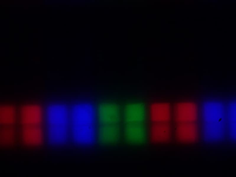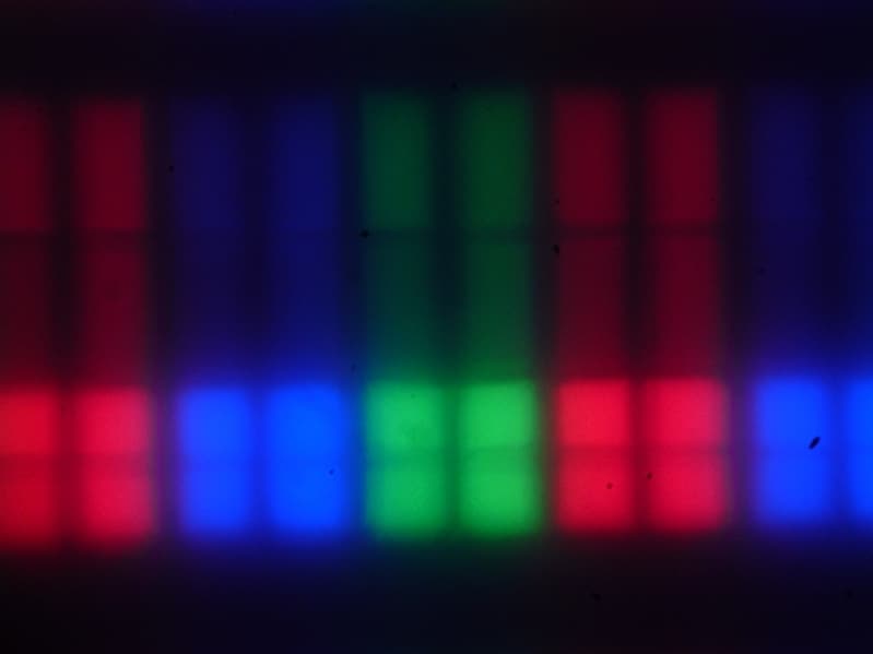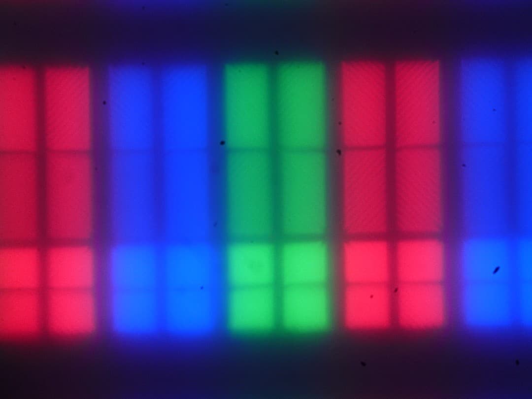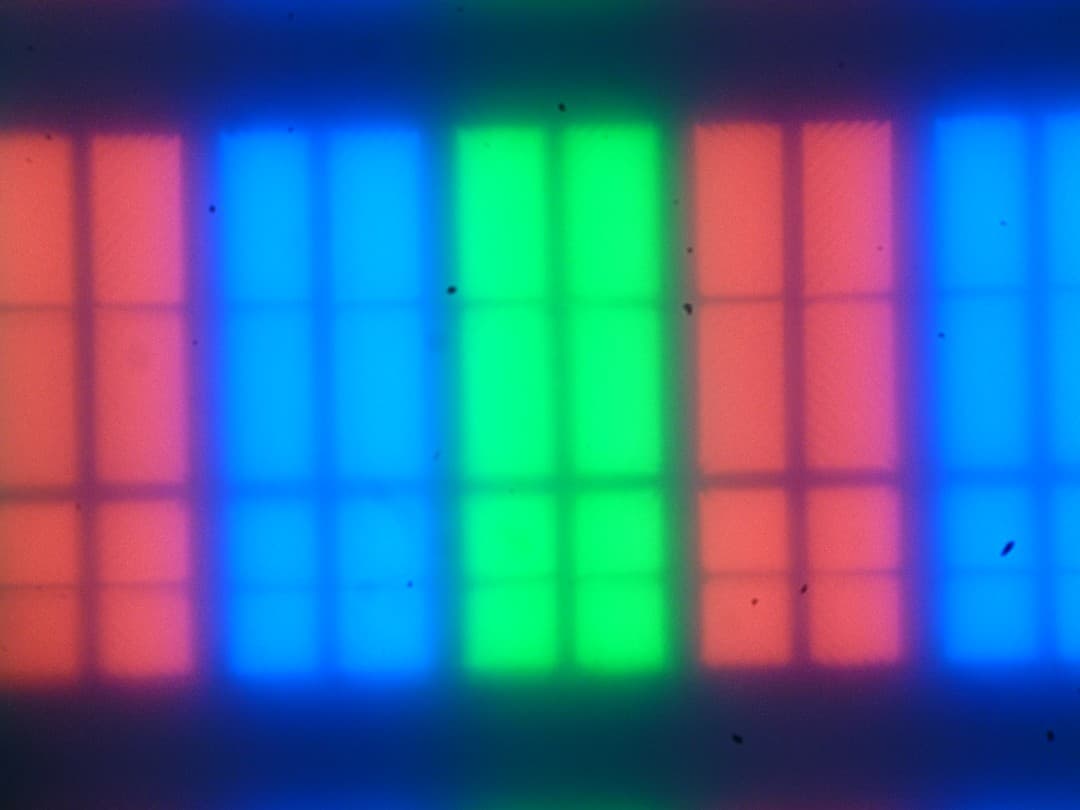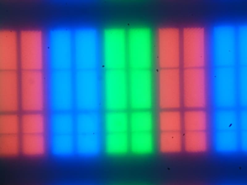 Четкое изображение структуры пикселей из-за матовой поверхности получить не удается, впрочем, при желании на фрагменте ниже можно разглядеть типичную для VA структуру в виде параллельных полосок. Субпиксели трех цветов (красного, зеленого и синего) поделены на две различающиеся по площади и независимо управляемые области, каждая из которых разделена на четыре участка с доменами в различающейся ориентации. Такое сложное устройство в принципе способно обеспечить широкий динамический диапазон по количеству оттенков, так как с ростом яркости области включаются последовательно, и хорошие углы обзора, чему способствует вариация ориентации ЖК в доменах (черные точки — это пыль на матрице фотоаппарата):