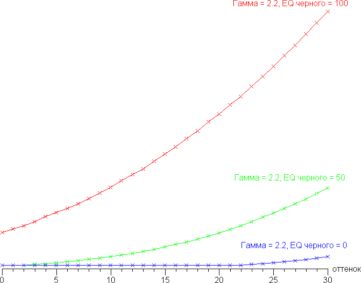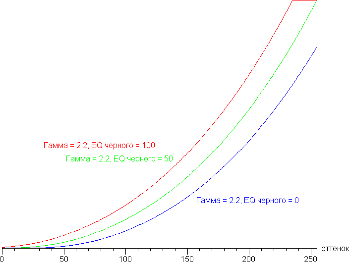 Дополнительной настройкой EQ черного (значения от 0 до 100, с шагом 10, по умолчанию 50) можно скорректировать гамма-кривую, улучшая (>50) или ухудшая (<50) различимость деталей в тенях. Первое может быть полезно в играх с темными сценами. Ниже приведены гамма-кривые при трех значениях этой настройки: