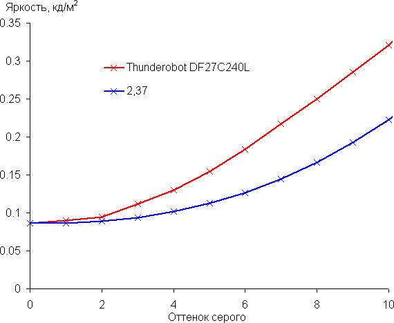 Рост прироста яркости весьма равномерный, и каждый следующий оттенок ярче предыдущего, даже в самой темной области: