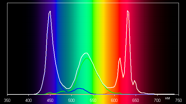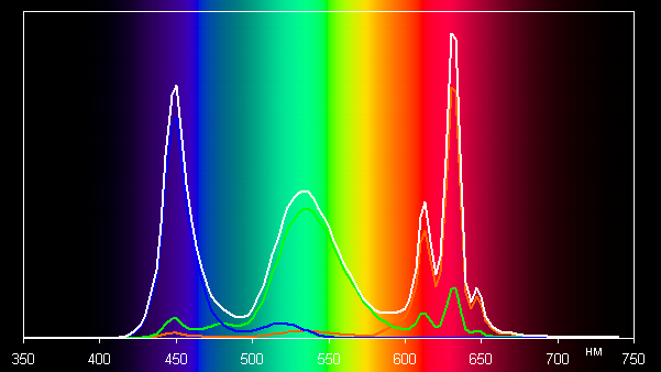 Ниже приведен спектр для белого поля (белая линия), наложенный на спектры красного, зеленого и синего полей (линии соответствующих цветов), когда в явном виде нет корректировки цветового охвата