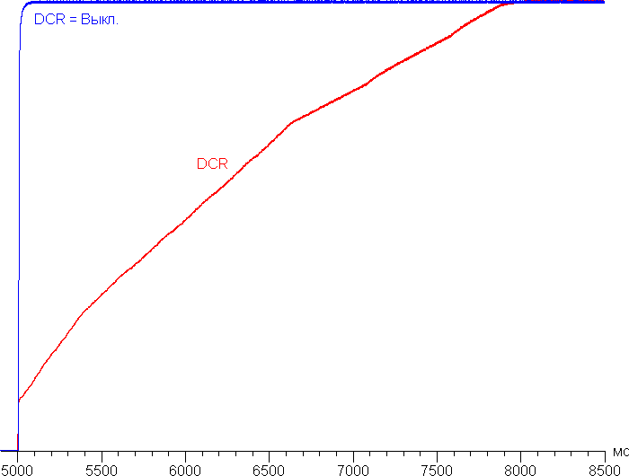 При включении режима с динамическим управлением яркости установившаяся контрастность формально возрастает до бесконечности, так как на черном поле во весь экран подсветка выключается совсем после примерно 15 секунд с момента переключения с белого поля на черное поле. График ниже показывает, как увеличивается яркость (вертикальная ось) при переключении с черного поля (после пяти секунд вывода) на белое при выключенной и включенной динамической подстройке яркости: