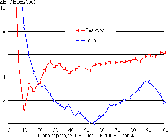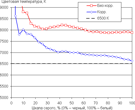 (Самый близкий к черному диапазон можно не учитывать, так как в нем цветопередача не так важна, а погрешность измерения цветовых характеристик высокая.) Впрочем, с практической точки зрения и с учетом игрового предназначения монитора особой необходимости в коррекции цветового баланса нет.