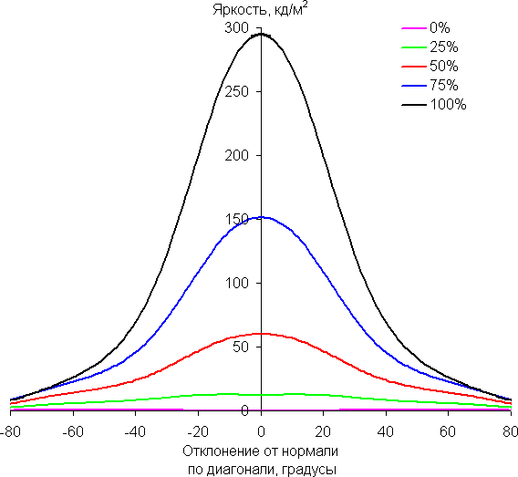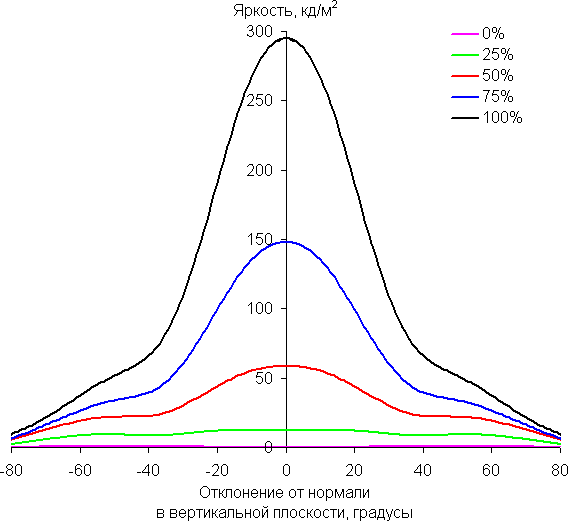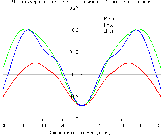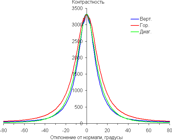 Из графиков следует, что при взгляде под углом хотя бы основные цвета меняются несильно, но полутона (особенно светло-синий) существенно изменяются, что ожидаемо для матрицы типа *VA и является ее основным недостатком.
