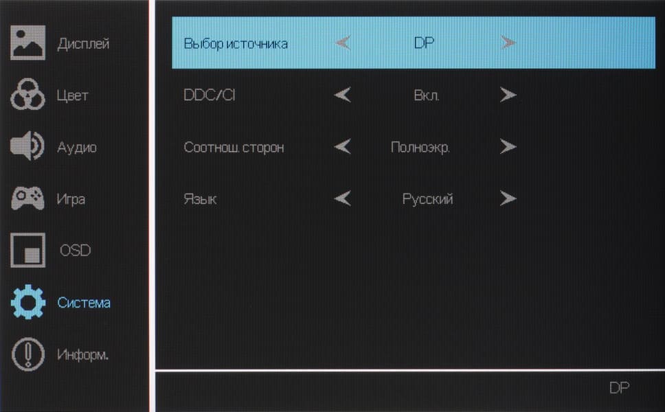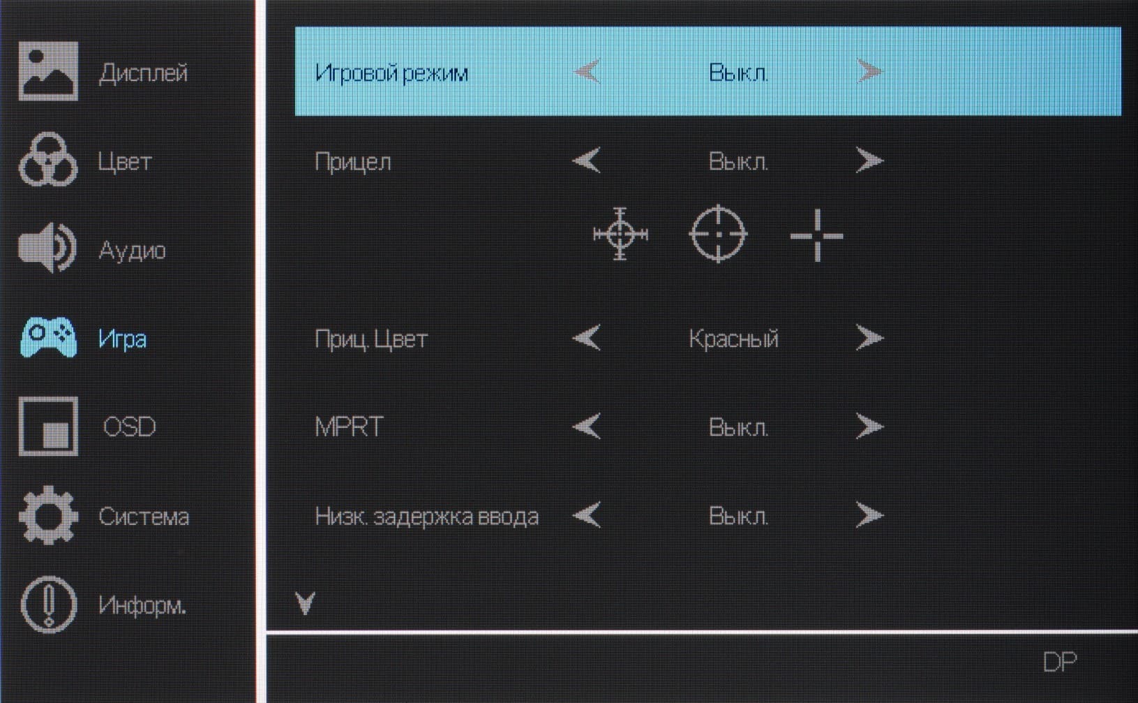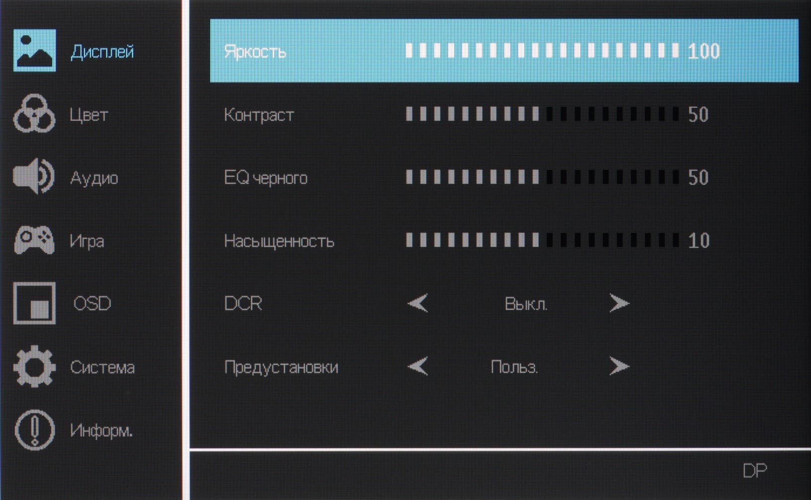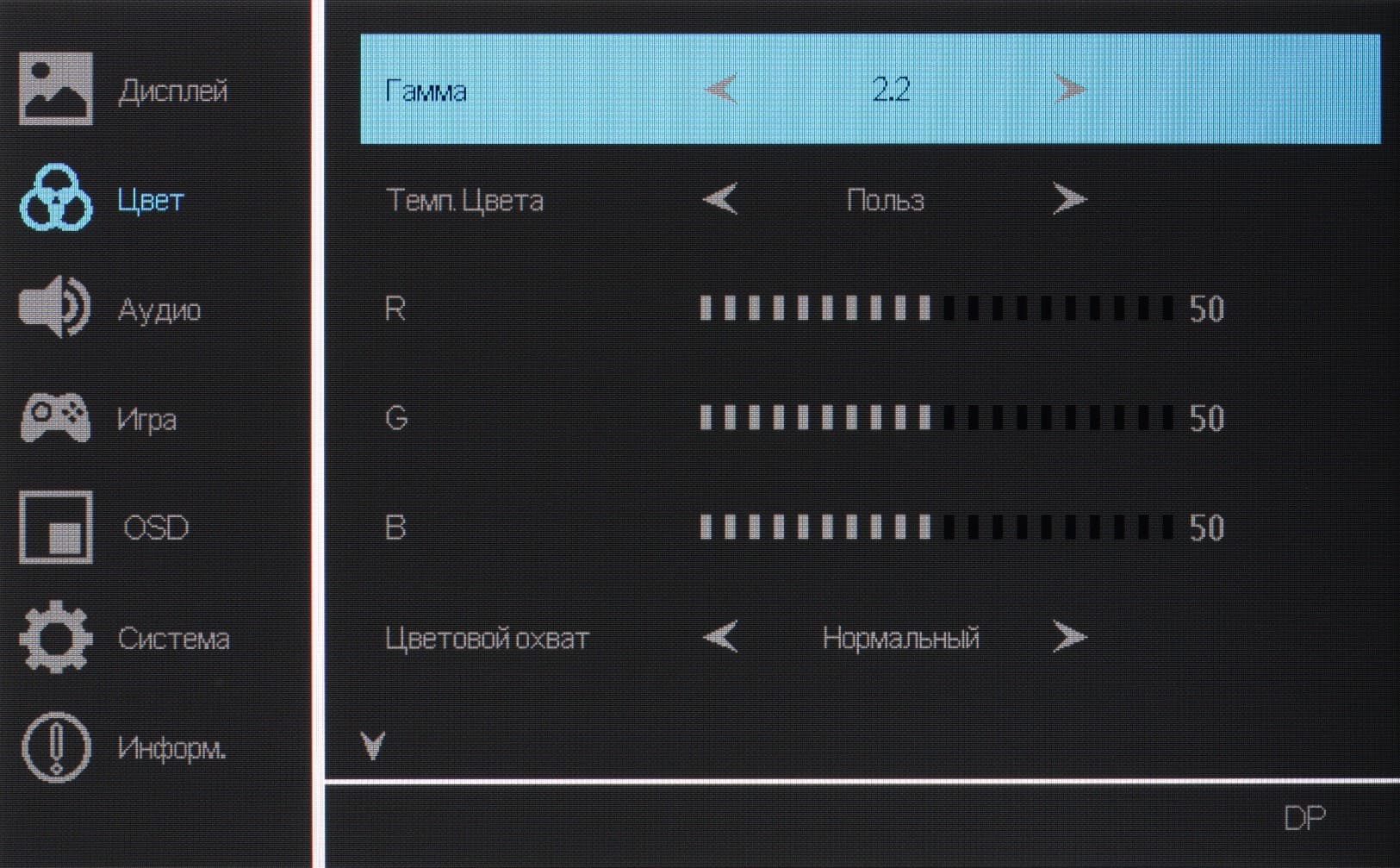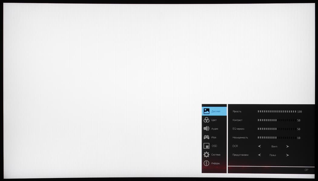 Настроек, влияющих на яркостный и цветовой баланс, не очень много, что для игрового монитора ожидаемо.