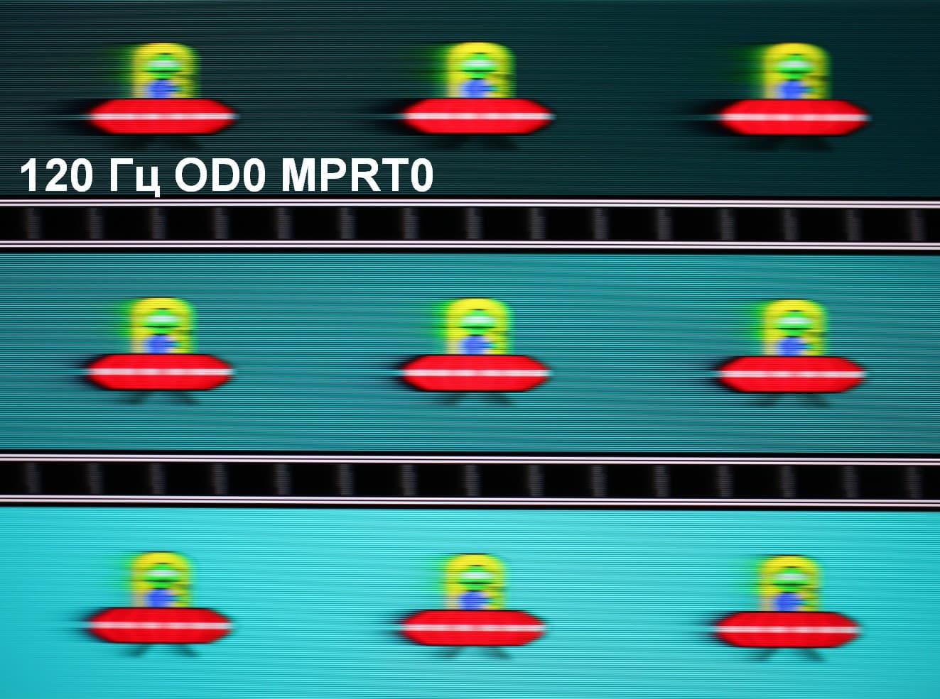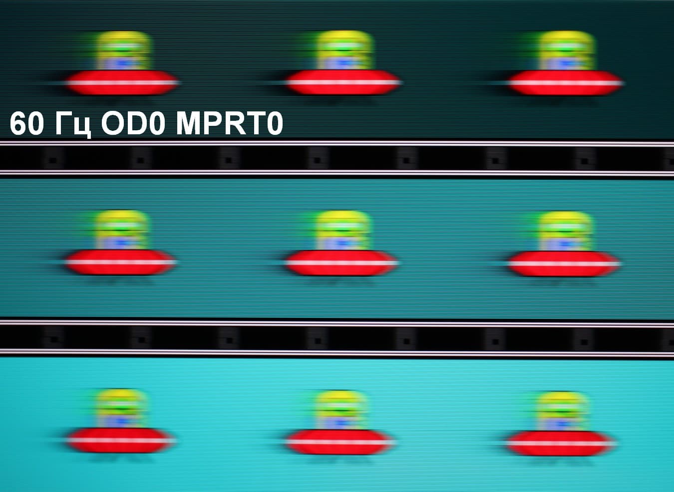 Для наглядного представления о том, что на практике означает такая скорость матрицы, какие могут быть артефакты от разгона и повышает ли четкость в движении, описанная выше настройка MPRT, приведем серию снимков, полученных с помощью движущейся камеры. Такие снимки показывают, что видит человек, если он следит глазами за двигающимся на экране объектом. Описание теста приведено тут, страница с самим тестом тут. Использовались рекомендованные установки (скорость движения 960 пиксель/с для частот обновления 60, 120 и 240 Гц), выдержка 1/15 с, на фотографиях указаны значения частоты обновления, а также включен ли разгон (ODx; x = 0 — выключен, x = 1 — включен) и режим вставки темного кадра (MPRTx).