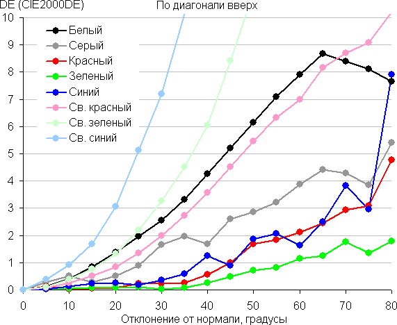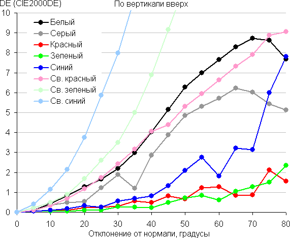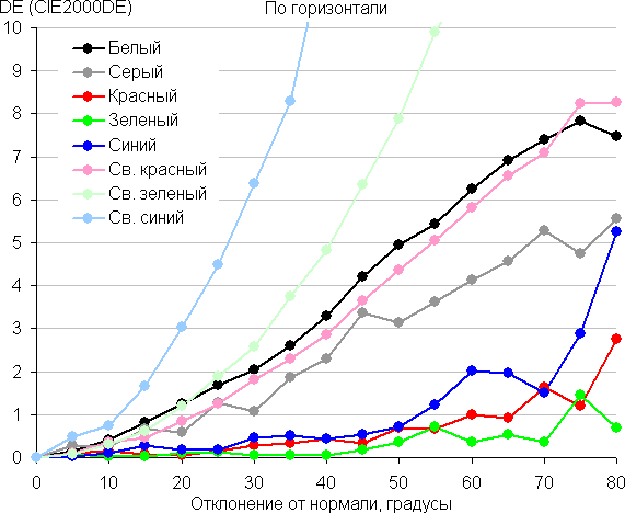 Для количественной характеристики изменения цветопередачи мы провели колориметрические измерения для белого, серого (127, 127, 127), красного, зеленого и синего, а также светло-красного, светло-зеленого и светло-синего полей во весь экран с использованием установки, подобной той, что применялась в предыдущем тесте. Измерения проводились в диапазоне углов от 0° (датчик направлен перпендикулярно к экрану) до 80° с шагом в 5°. Полученные значения интенсивностей были пересчитаны в ΔE относительно замера каждого поля при перпендикулярном положении датчика относительно экрана. Результаты представлены ниже:
