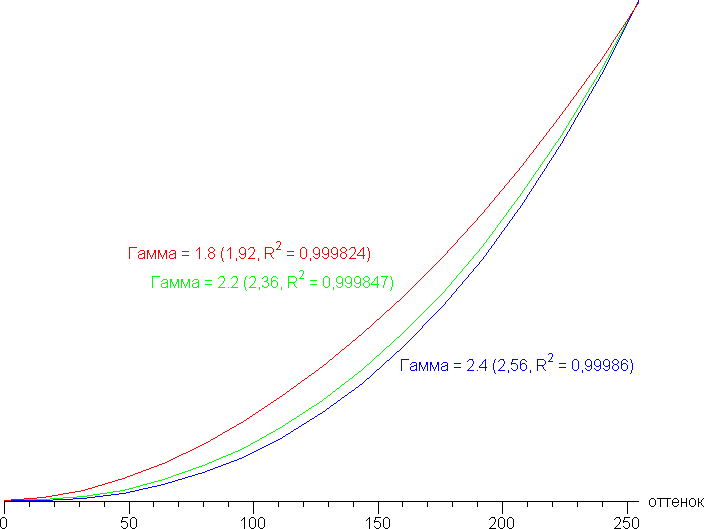 Реальная гамма-кривая зависит от выбранного профиля в списке Гамма (значения показателей аппроксимирующей функции приведены в скобках в подписях, там же — коэффициент детерминации):