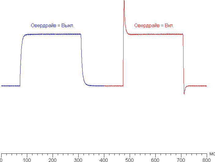 При включении разгона на графиках некоторых переходов появляются характерные всплески яркости. Ниже приведены графики полутонового перехода между оттенками 60% и 80% и обратно (по вертикали — яркость, по горизонтали — время, для наглядности графики выстроены последовательно):