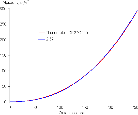 Аппроксимация полученной гамма-кривой дала показатель 2,37, что немного выше стандартного значения 2,2, поэтому картинка чуть затемнена. При этом реальная гамма-кривая мало отклоняется от аппроксимирующей степенной функции: