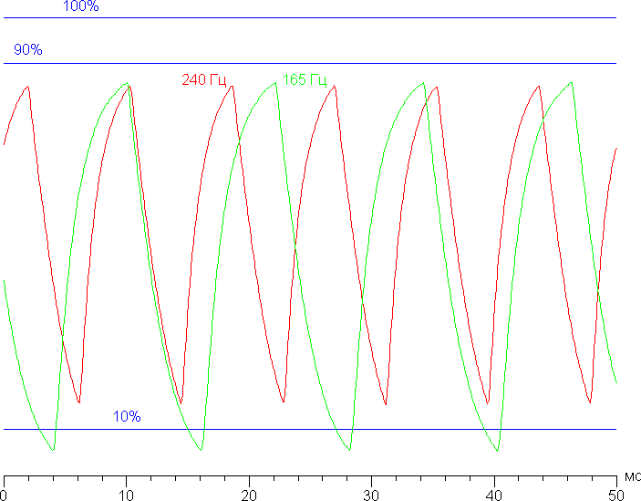 Видно, что при 240 Гц максимальная яркость белого кадра ниже уровня 90% от белого, а минимальная яркость черного кадра выше 10% от белого. Амплитуда изменения яркости меньше 80% от уровня белого. То есть согласно этому формальному критерию скорости матрицы недостаточно для вывода изображения с кадровой частотой 240 Гц. В случае 165 Гц уже достаточно, так как амплитуда изменения яркости порядка 80%.
