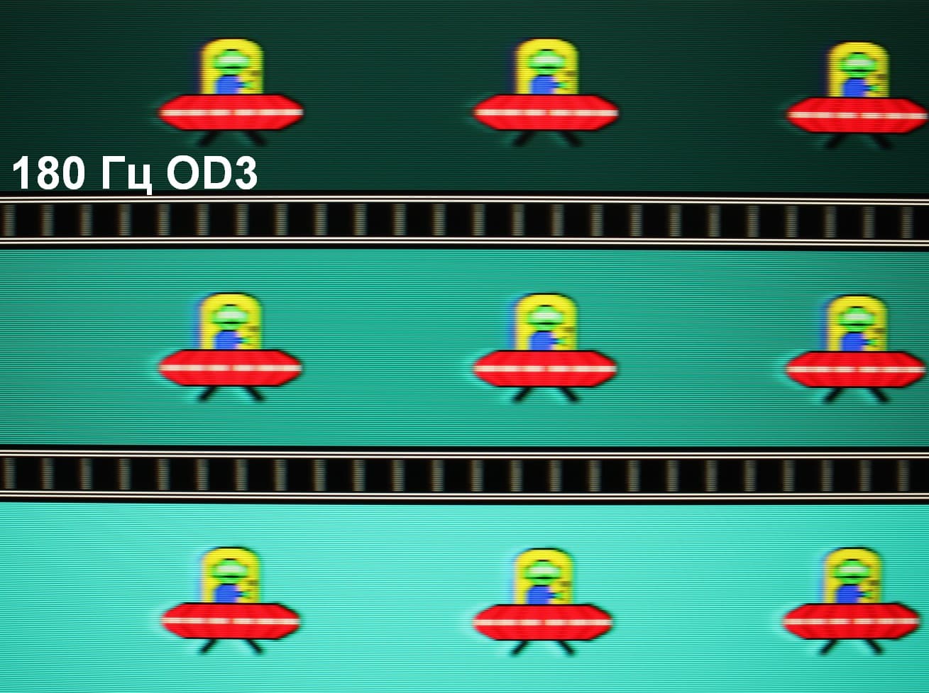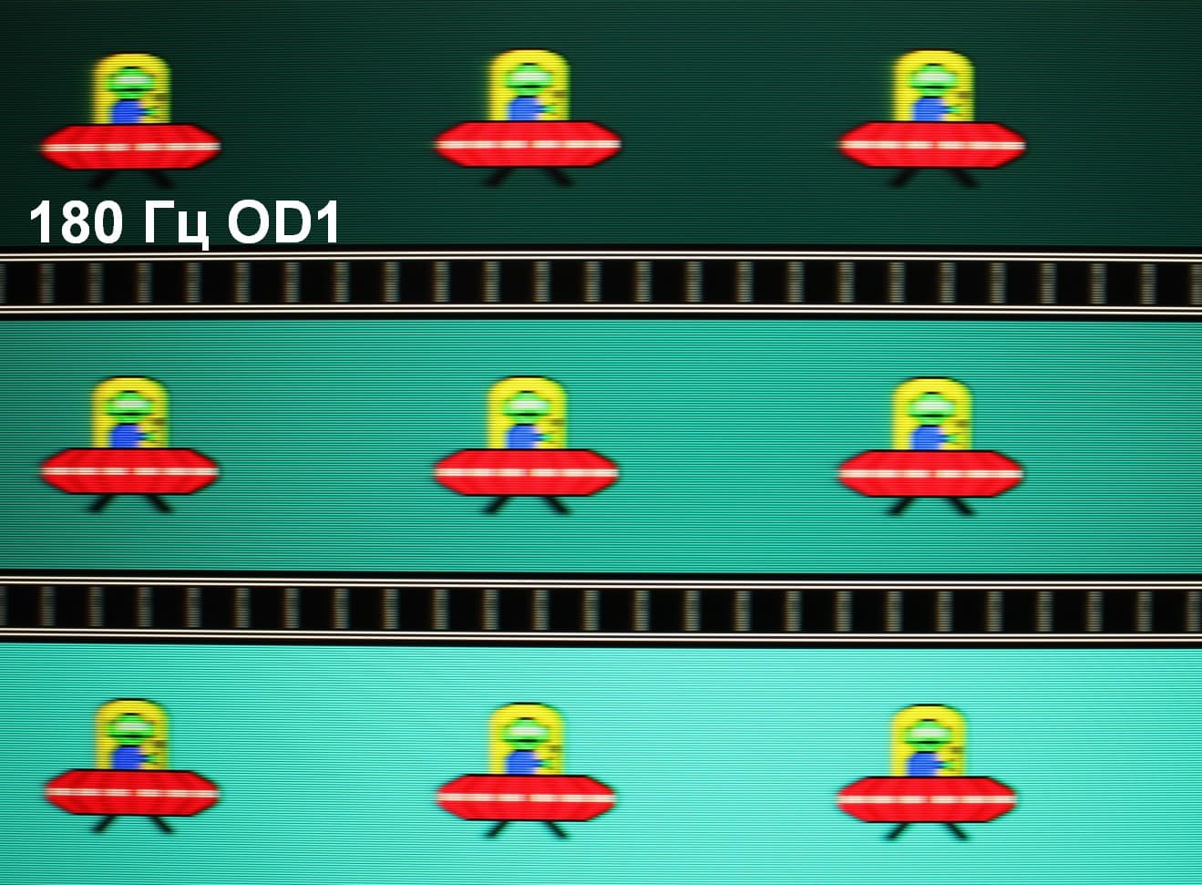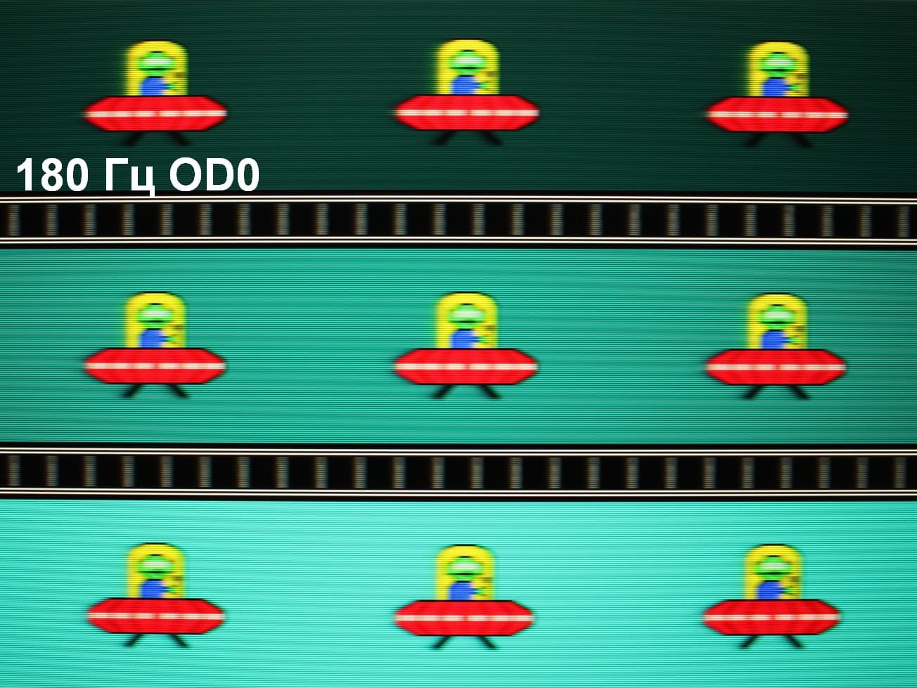 Для наглядного представления о том, что на практике означает такая скорость матрицы, и какие могут быть артефакты от разгона, приведем серию снимков, полученных с помощью движущейся камеры. Такие снимки показывают, что видит человек, если он следит глазами за двигающимся на экране объектом. Описание теста приведено тут, страница с самим тестом тут. Использовались рекомендованные установки (скорость движения 960 пиксель/с для частот обновления 60 и 120 Гц или 900 пиксель/с для 180 Гц, то есть на целое число пикселей за кадр), выдержка 1/15 с. На фотографиях указаны значения частоты обновления, а также включен ли разгон (ODx; x = 0 — 3) и режим вставки темного кадра (MPRT).