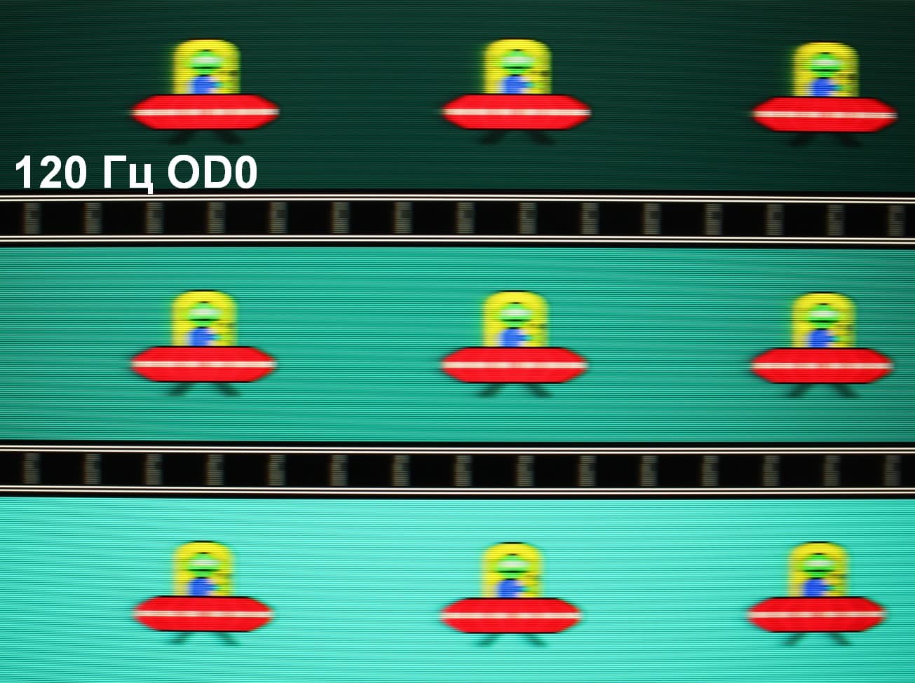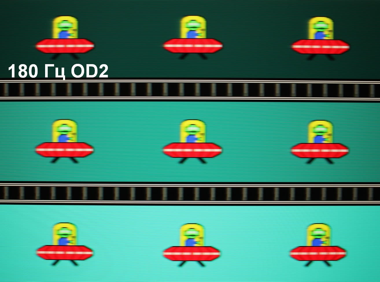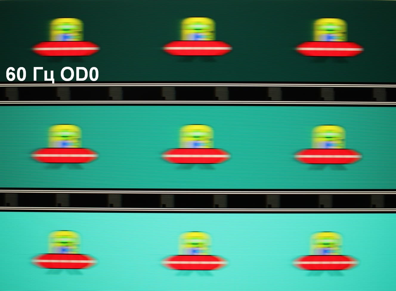 Для наглядного представления о том, что на практике означает такая скорость матрицы, и какие могут быть артефакты от разгона, приведем серию снимков, полученных с помощью движущейся камеры. Такие снимки показывают, что видит человек, если он следит глазами за двигающимся на экране объектом. Описание теста приведено тут, страница с самим тестом тут. Использовались рекомендованные установки (скорость движения 960 пиксель/с для частот обновления 60 и 120 Гц или 900 пиксель/с для 180 Гц, то есть на целое число пикселей за кадр), выдержка 1/15 с. На фотографиях указаны значения частоты обновления, а также включен ли разгон (ODx; x = 0 — 3) и режим вставки темного кадра (MPRT).