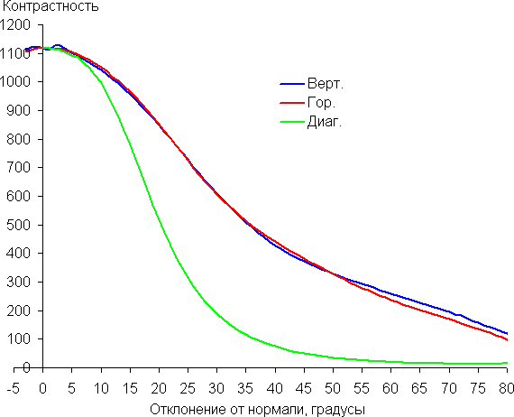 По скорости падения яркости углы обзора неширокие. Отметим примерно одинаковый характер уменьшения яркости при отклонении от перпендикуляра к экрану во всех трех направлениях, при этом графики не пересекаются в значимом диапазоне измеряемых углов. При отклонении в диагональном направлении яркость черного поля начинает резко возрастать уже при 20° отклонения от перпендикуляра к экрану. Если сидеть не очень далеко от экрана, то черное поле по углам будет заметно светлее, чем в центре (оставаясь примерно нейтрально-серым по оттенку). Контрастность в диапазоне углов ±82° приближается к отметке 10:1 только при отклонении по диагонали, но все равно остается выше этого значения.