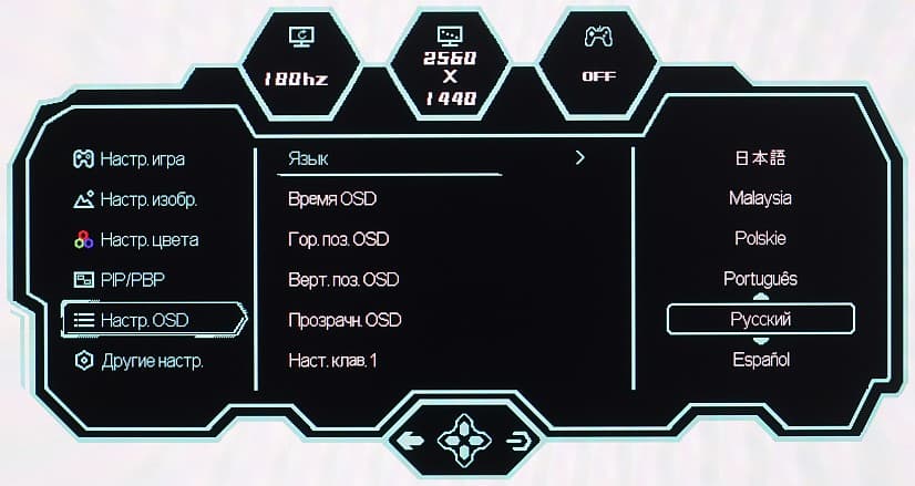 Можно настроить положение меню на экране, отрегулировать прозрачность фона меню, перевернуть меню с шагом 90 градусов и выбрать задержку автоматического выхода из меню. Присутствует русская версия экранного меню.