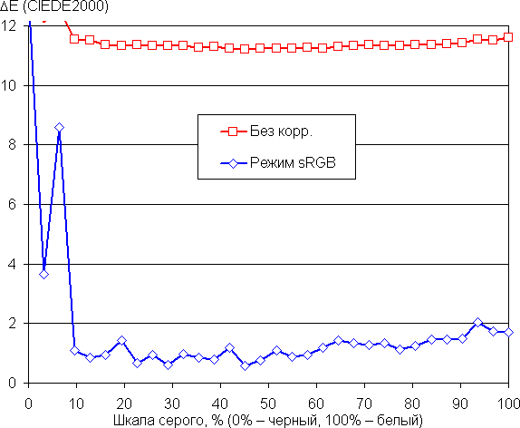Цветовой баланс при выборе одного из трех профилей Пользователь 1-3 (и без коррекции), которые обеспечивают максимальную яркость и контрастность с сохранением приемлемого качества изображения, компромиссный, так как цветовая температура близка к стандартным 6500 К, но отклонение от спектра абсолютно черного тела (параметр ΔE) выше 10 единиц, что даже для потребительского устройства считается не очень хорошим показателем. При выборе профиля sRGB цветовой баланс лучше, так как ΔE становится ниже 2 единиц. Графики ниже показывают цветовую температуру на различных участках шкалы серого и ΔE: