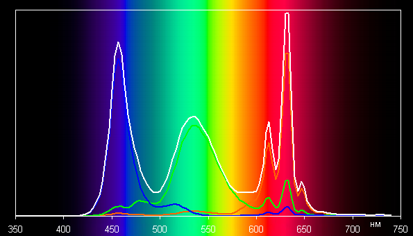 Ниже приведен спектр для белого поля (белая линия), наложенный на спектры красного, зеленого и синего полей (линии соответствующих цветов), когда в явном виде нет корректировки цветового охвата