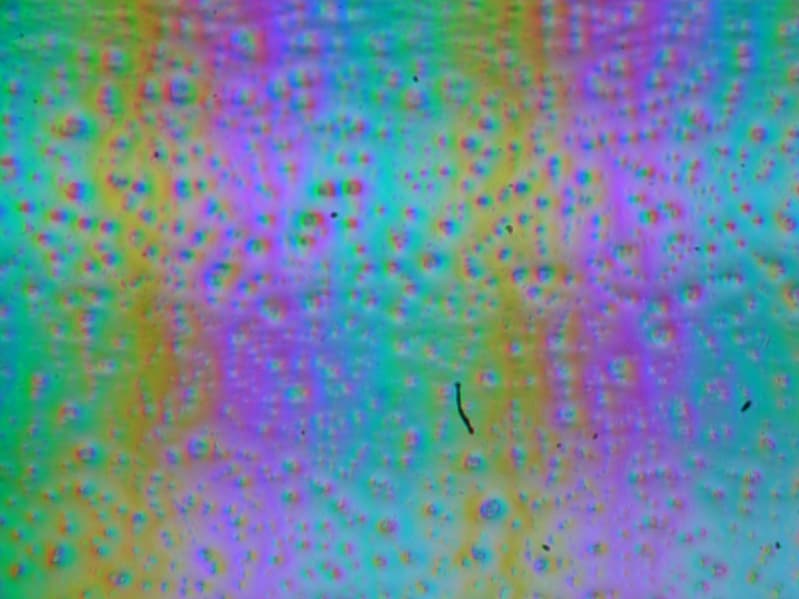 Зерно этих дефектов в несколько раз меньше размеров субпикселей, поэтому фокусировка на микродефектах и «перескок» фокуса по субпикселям при изменении угла зрения отсутствуют, из-за этого нет и «кристаллического» эффекта.