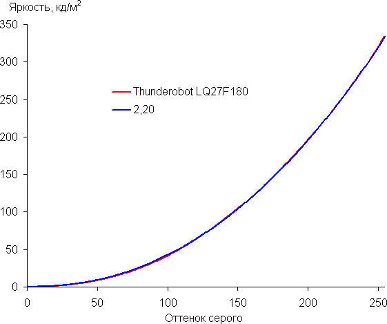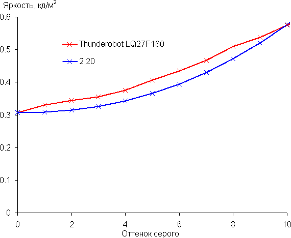 Рост прироста яркости на большей части шкалы серого весьма равномерный, и каждый следующий оттенок значимо ярче предыдущего, однако белый слишком близок по яркости к самому светлому оттенку серого.