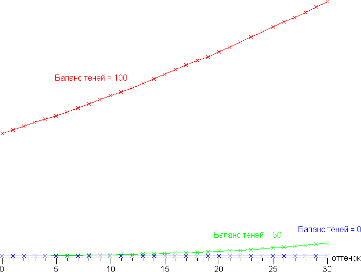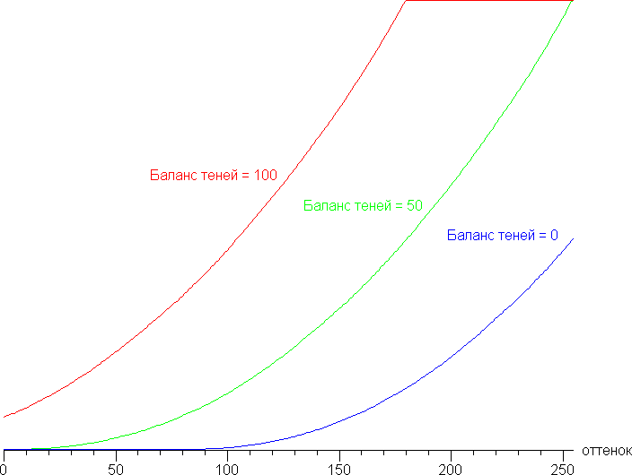 Дополнительной настройкой Баланс теней (значения от 0 до 100, с шагом 1, по умолчанию 50) можно скорректировать гамма-кривую, улучшая (>50) или ухудшая (<50) различимость деталей в тенях. Первое может быть полезно в играх с темными сценами. Ниже приведены гамма-кривые при трех значениях этой настройки: