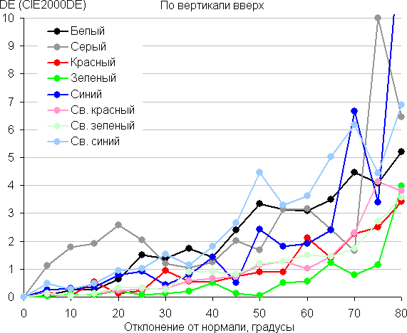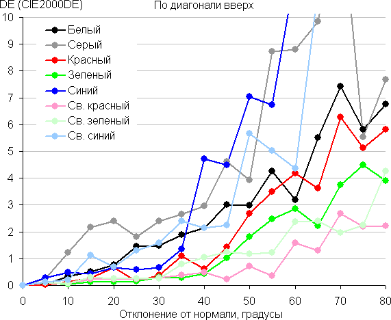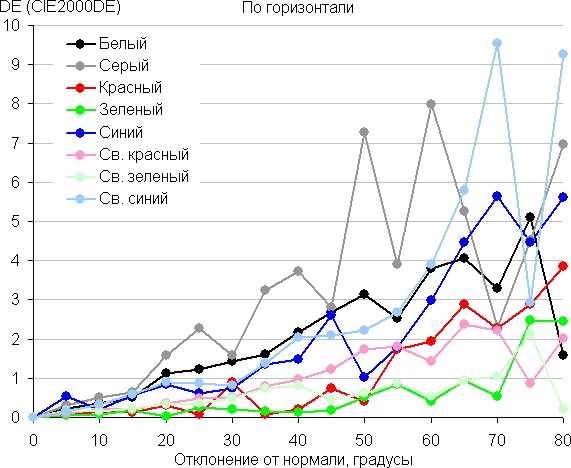 Для количественной характеристики изменения цветопередачи мы провели колориметрические измерения для белого, серого (127, 127, 127), красного, зеленого и синего, а также светло-красного, светло-зеленого и светло-синего полей во весь экран с использованием установки, подобной той, что применялась в предыдущем тесте. Измерения проводились в диапазоне углов от 0° (датчик направлен перпендикулярно к экрану) до 80° с шагом в 5°. Полученные значения интенсивностей были пересчитаны в ΔE относительно замера каждого поля при перпендикулярном положении датчика относительно экрана. Результаты представлены ниже: