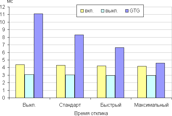 Время отклика зависит от значения одноименной настройки, которая управляет разгоном матрицы. График ниже показывает, как меняется время включения и выключения при переходе черный-белый-черный (столбики «вкл.» и «выкл.»), а также среднее суммарное время для переходов между полутонами (столбики GTG) в случае режима с частотой обновления 180 Гц для четырех значений этой настройки: